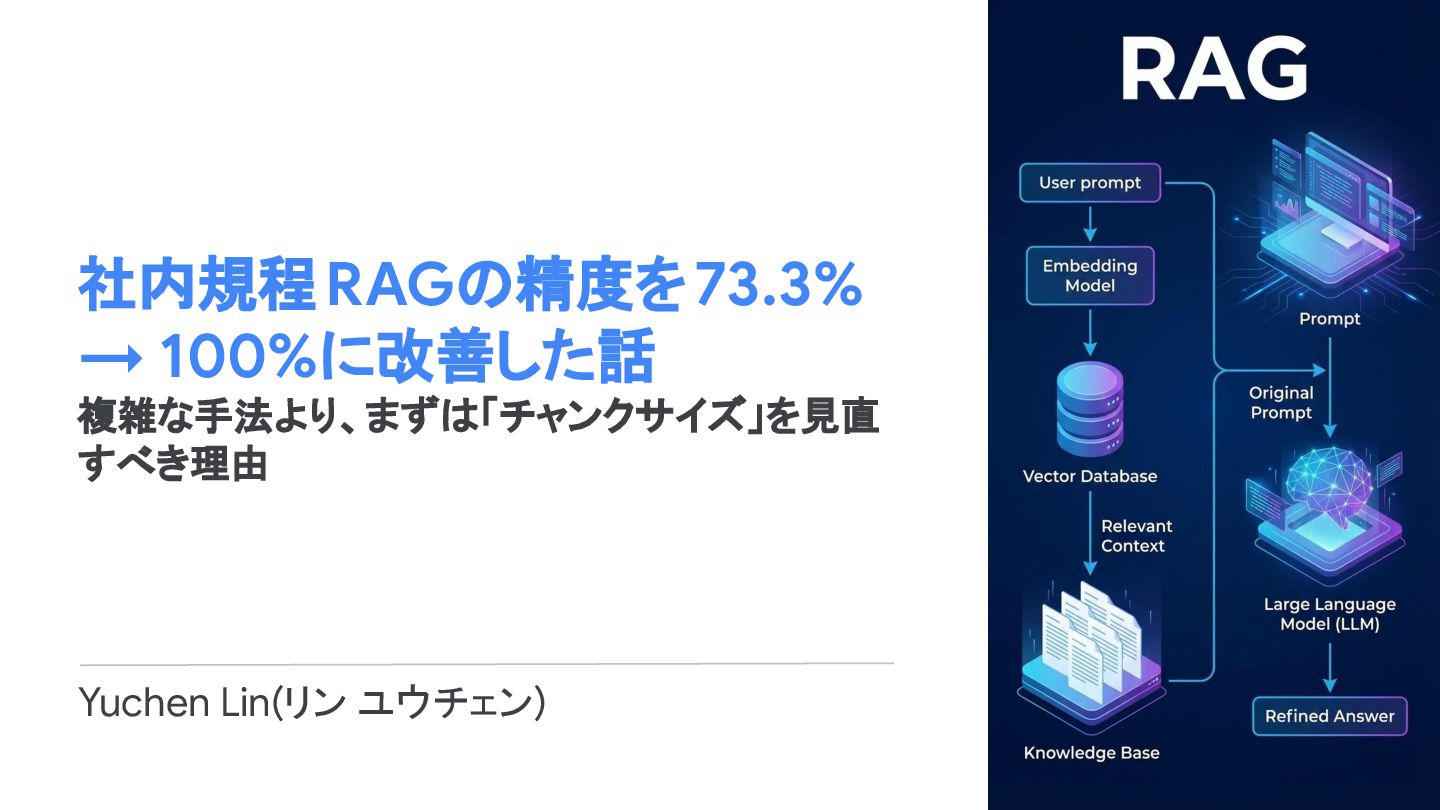 社内規程RAGの精度を73.3% → 100%に改善した話 複雑な手法より、まずは「チャンクサイズ」を見直 すべき理由 Yuchen Lin(リン ユウチェン)