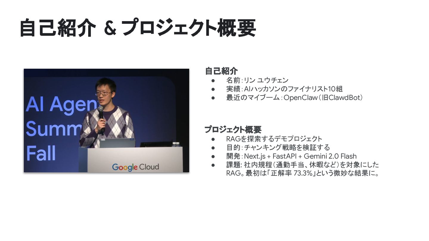 最近のマイブーム:OpenClaw(旧ClawdBot) プロジェクト概要 • RAGを探索するデモプロジェクト • 目的:チャンキング戦略を検証する • 開発:Next.js + FastAPI + Gemini 2.0 Flash • 課題: 社内規程(通勤手当、休暇など)を対象にした RAG。最初は「正解率 73.3%」という微妙な結果に。