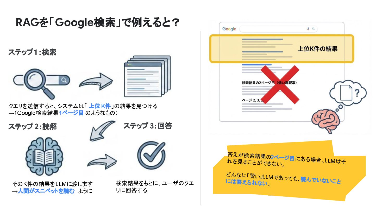 RAGを「Google検索」で例えると? ステップ1:検索 ステップ 2:読解 クエリを送信すると、システムは「 上位K件」の結果を見つける →(Google検索結果1ページ目 のようなもの) そのK件の結果をLLMに渡します →人間がスニペットを読む