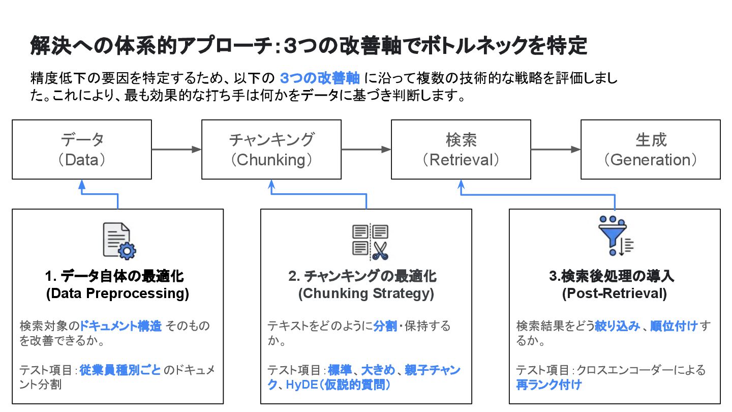 解決への体系的アプローチ:3つの改善軸でボトルネックを特定 精度低下の要因を特定するため、以下の 3つの改善軸 に沿って複数の技術的な戦略を評価しまし た。これにより、最も効果的な打ち手は何かをデータに基づき判断します。 データ (Data) チャンキング (Chunking) 検索