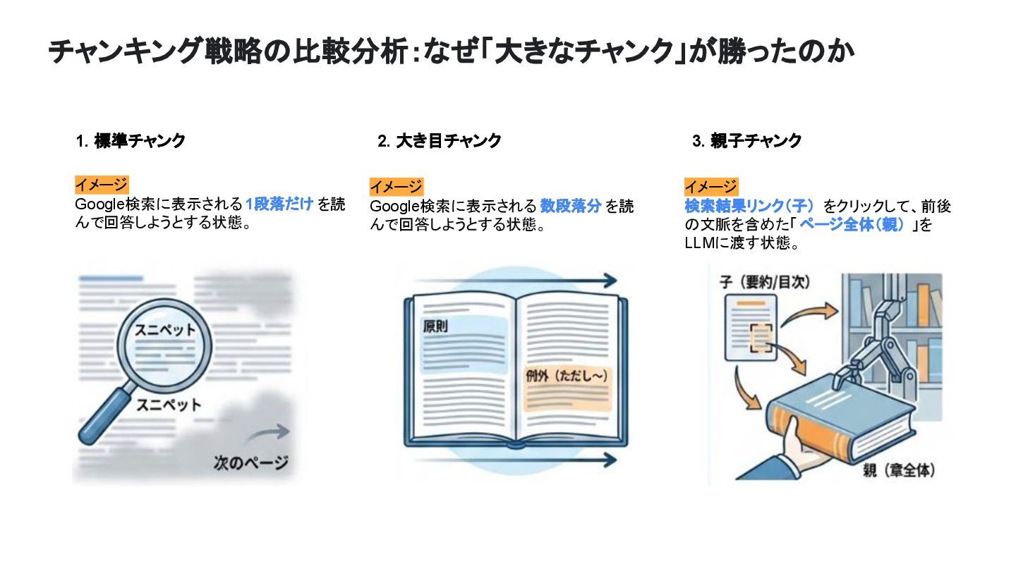 チャンキング戦略の比較分析:なぜ「大きなチャンク」が勝ったのか 1. 標準チャンク イメージ Google検索に表示される 1段落だけ を読 んで回答しようとする状態。 イメージ 検索結果リンク(子)