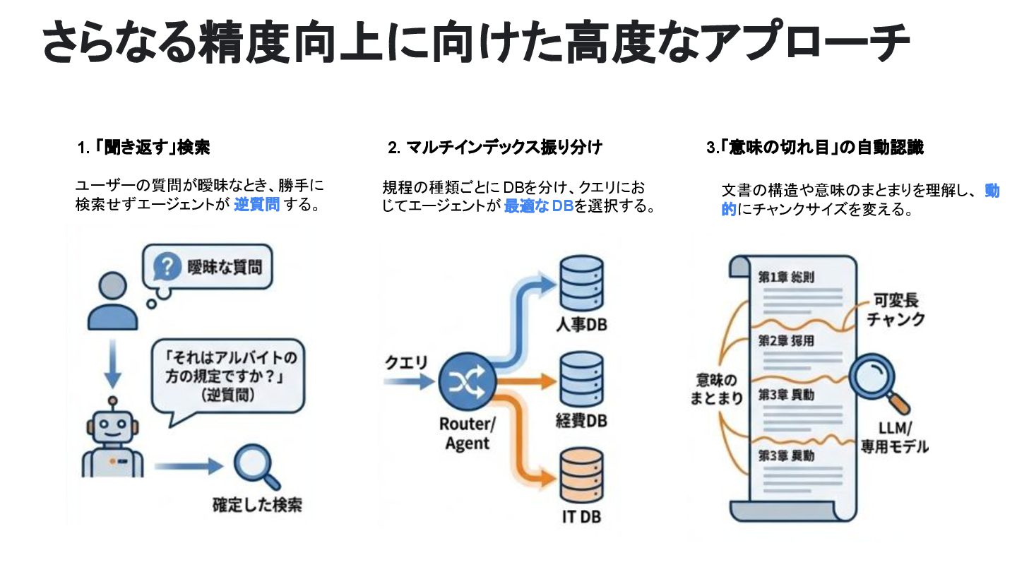 さらなる精度向上に向けた高度なアプローチ 1. 「聞き返す」検索 2. マルチインデックス振り分け 3.「意味の切れ目」の自動認識 ユーザーの質問が曖昧なとき、勝手に 検索せずエージェントが 逆質問 する。