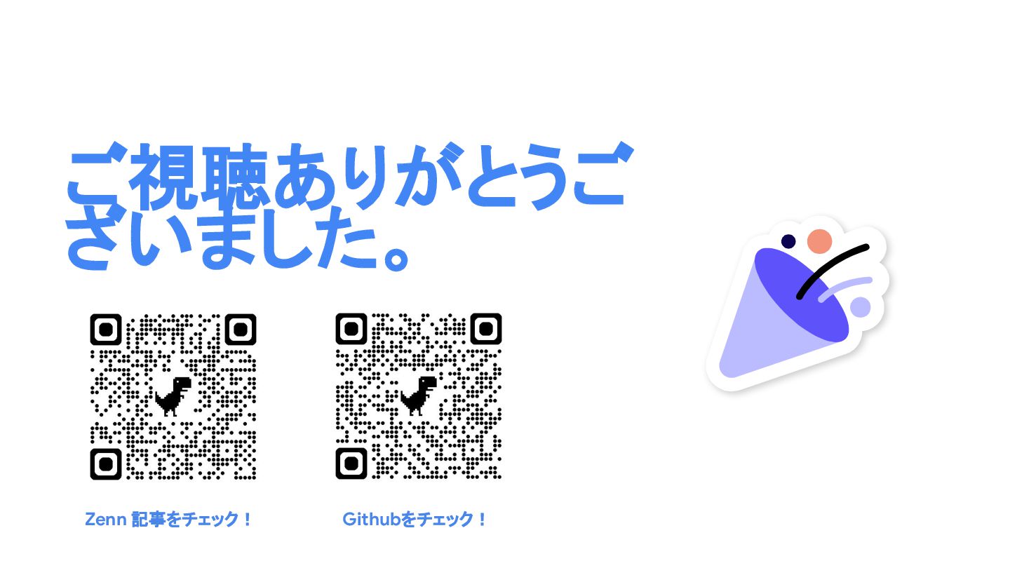 Zenn 記事をチェック! ご視聴ありがとうご ざいました。 Githubをチェック!