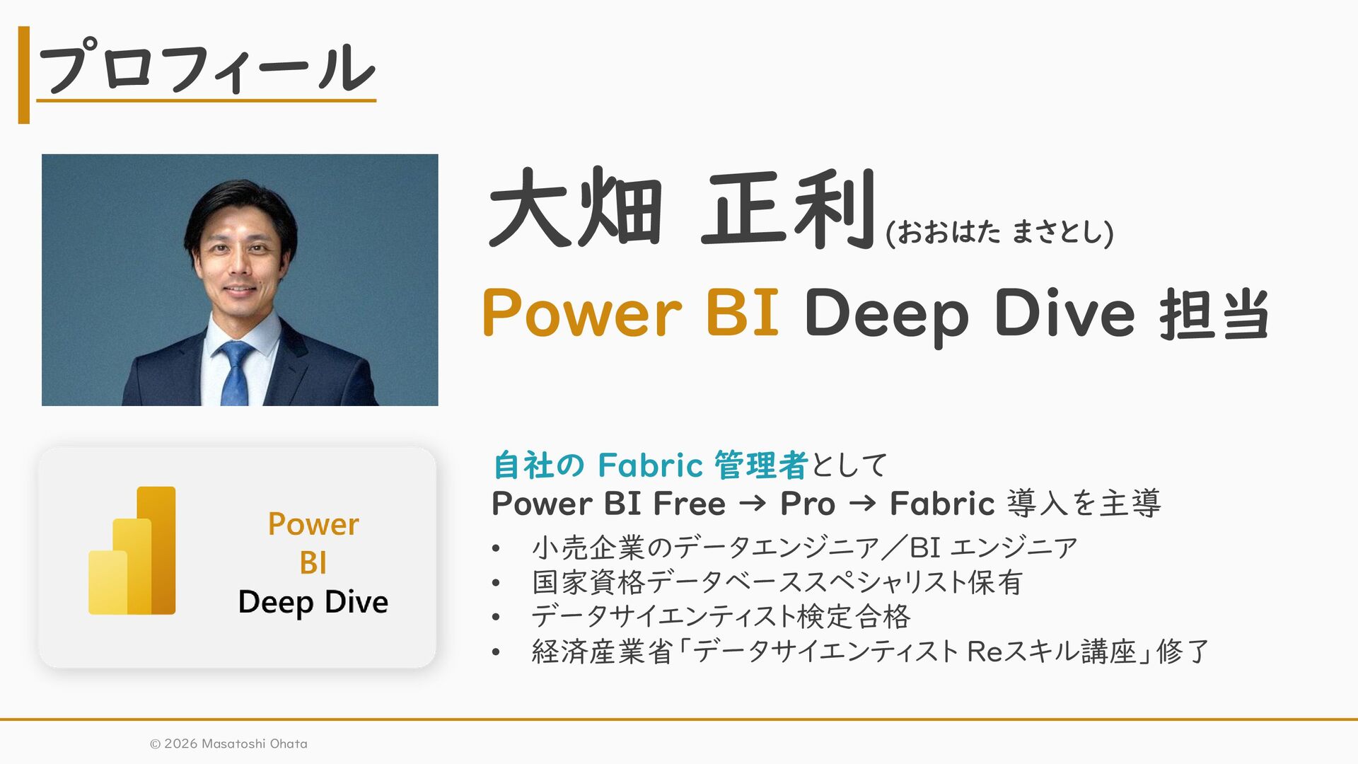 Free → Pro → Fabric 導入を主導 © 2026 Masatoshi Ohata • 小売企業のデータエンジニア/BI エンジニア • 国家資格データベーススペシャリスト保有 • データサイエンティスト検定合格 • 経済産業省「データサイエンティスト Reスキル講座」修了 Power BI Deep Dive 担当