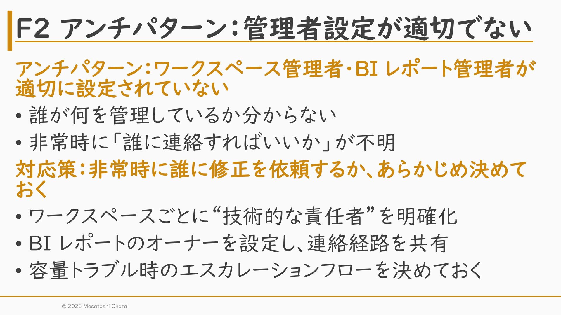 ワークスペースごとに“技術的な責任者”を明確化 • BI レポートのオーナーを設定し、連絡経路を共有 • 容量トラブル時のエスカレーションフローを決めておく F2 アンチパターン:管理者設定が適切でない © 2026 Masatoshi Ohata