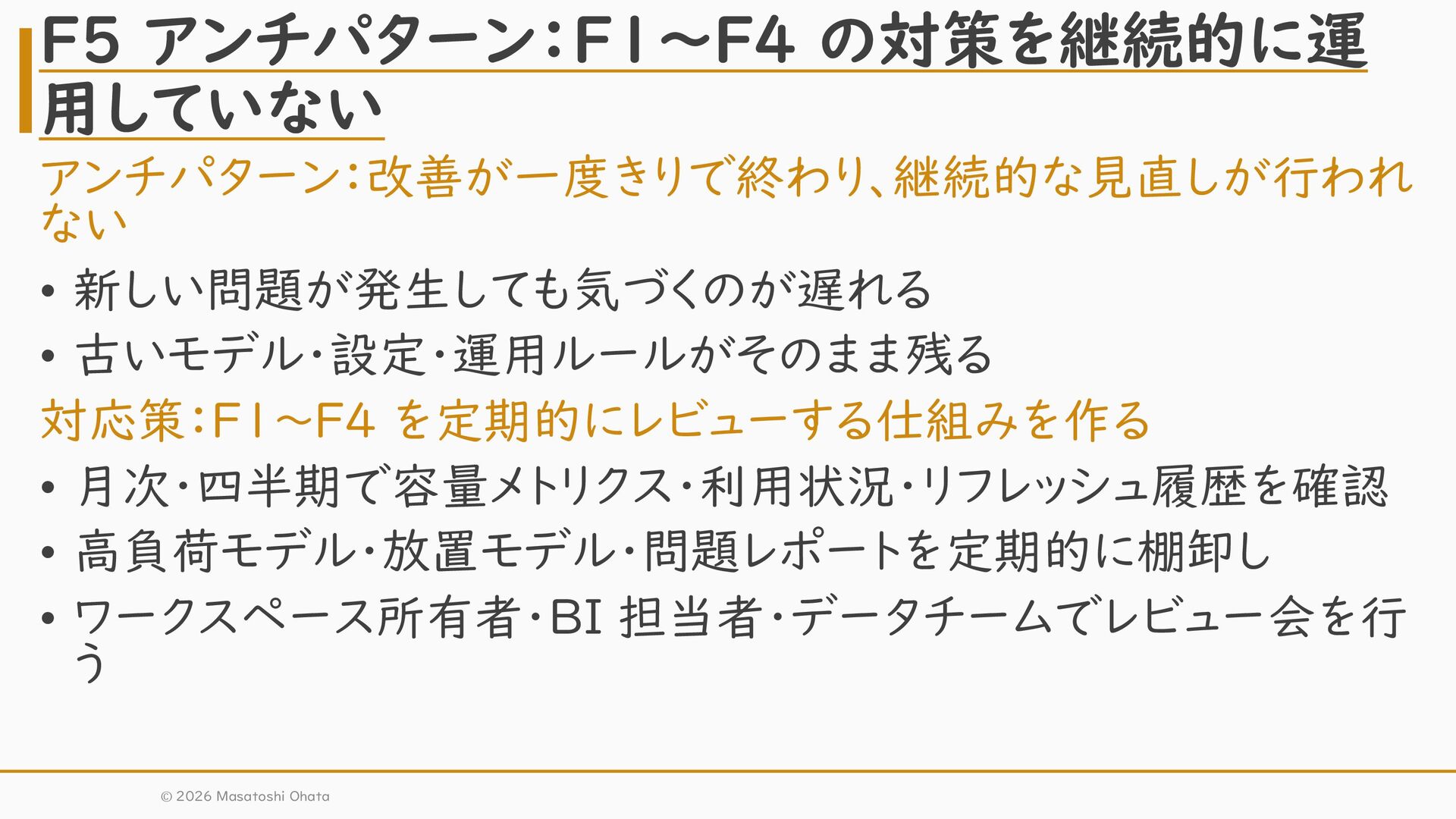 • 高負荷モデル・放置モデル・問題レポートを定期的に棚卸し • ワークスペース所有者・BI 担当者・データチームでレビュー会を行 う F5 アンチパターン:F1〜F4 の対策を継続的に運 用していない © 2026 Masatoshi Ohata