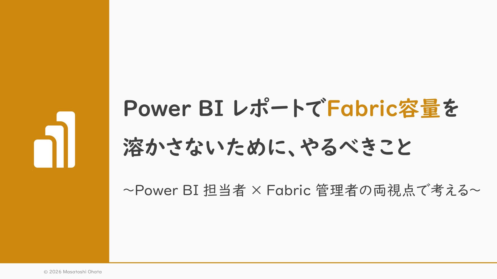 のことはよく分からないから、そっちで何とかして」 → これは Fabric 管理者側の“よくある誤解” • しかし、Power BI 担当者は、 容量メトリクスが見えない/容量の仕組みを知らない → 改善ポイントが分からず、対応が進まない • 結果として、容量消費の問題が長期化しやすい • Fabric 管理者も Power BI の改善方法を理解しておく必要がある 容量トラブルは Power BI 担当者だけでは解決できない © 2026 Masatoshi Ohata