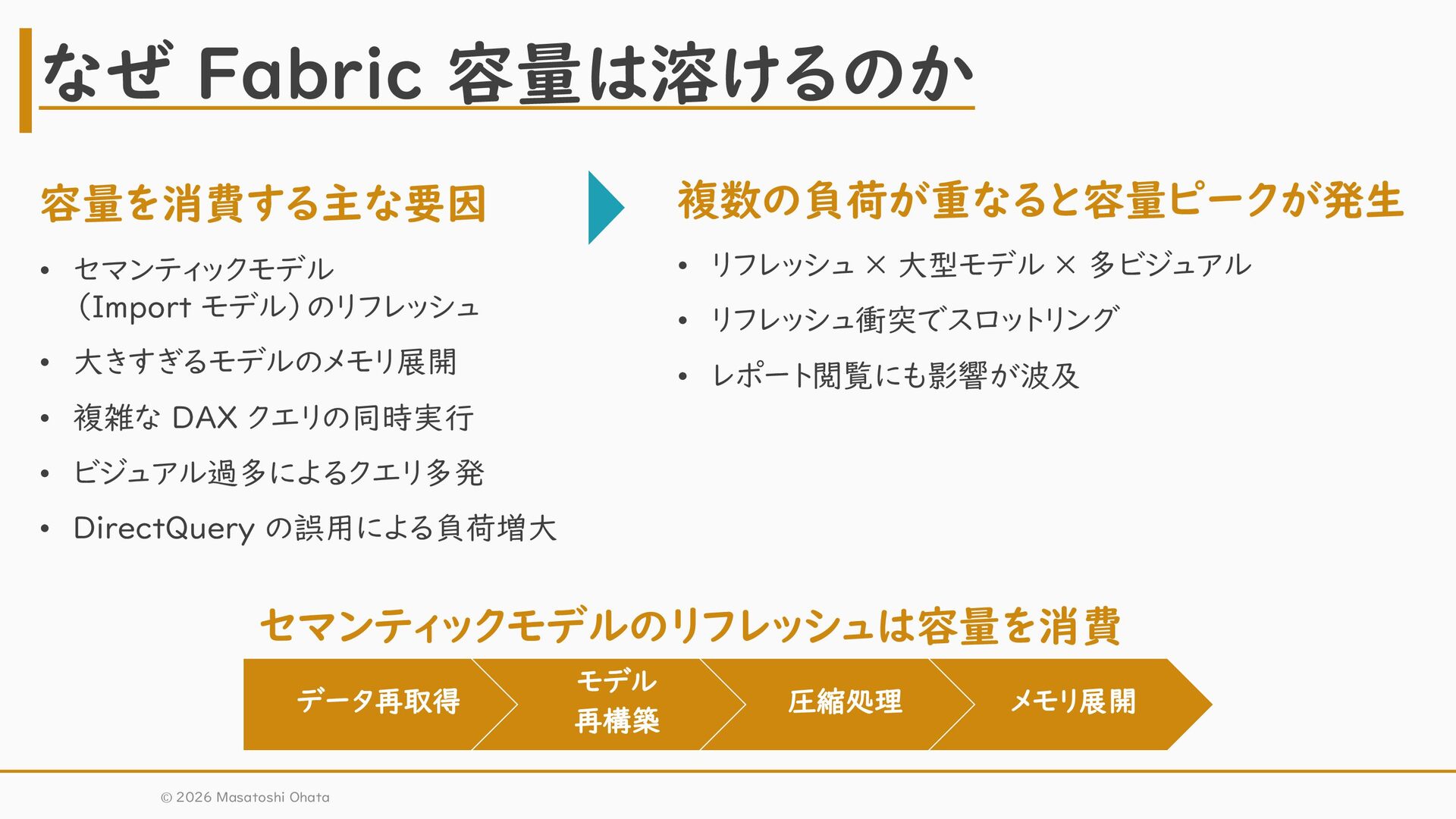 © 2026 Masatoshi Ohata なぜ Fabric 容量は溶けるのか 容量を消費する主な要因 • セマンティックモデル