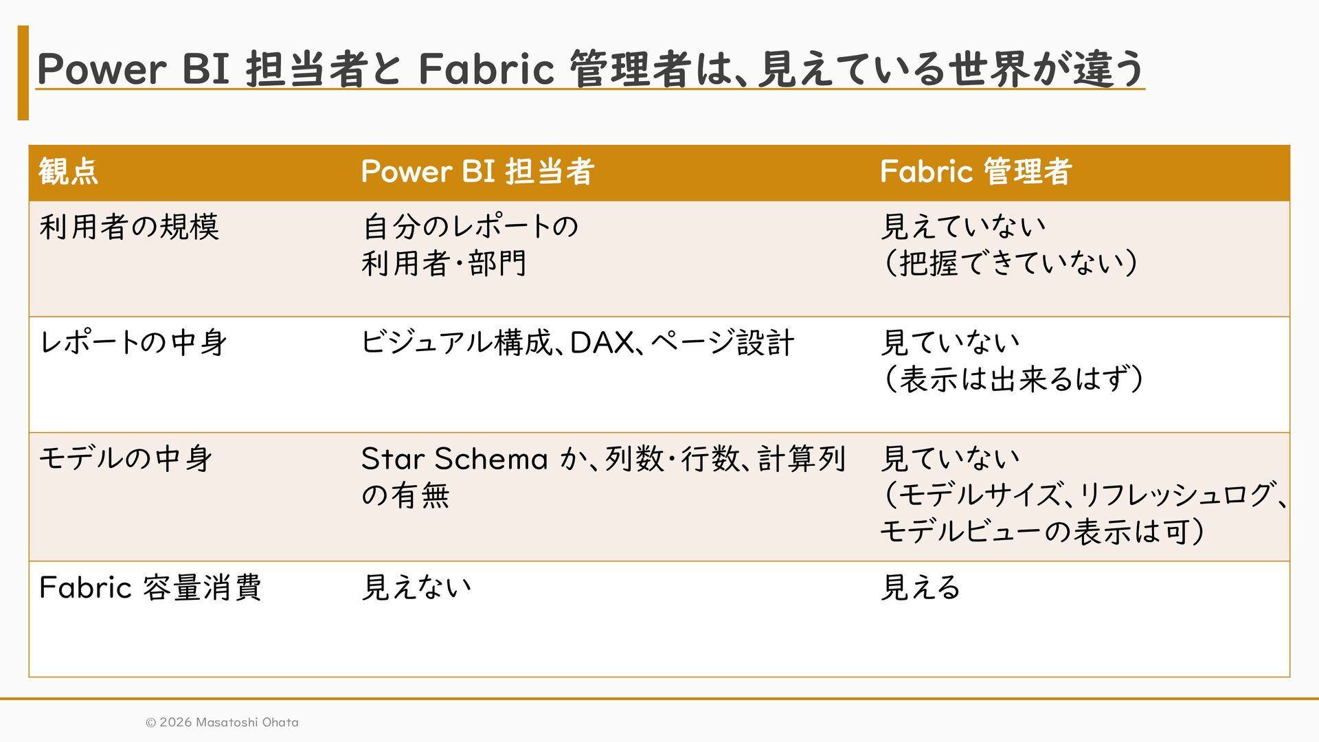 © 2026 Masatoshi Ohata Power BI 担当者と Fabric 管理者は、見えている世界が違う 観点