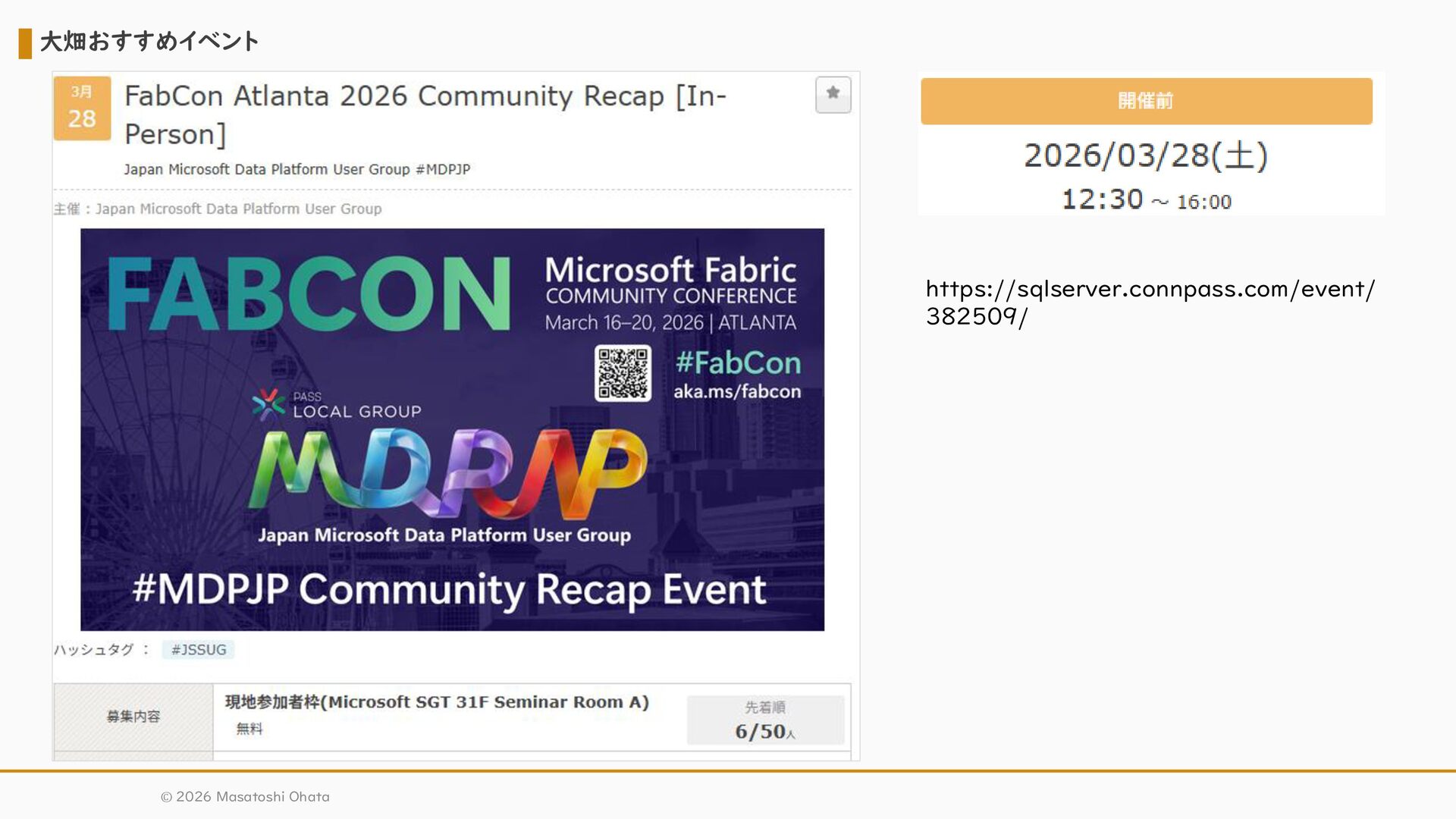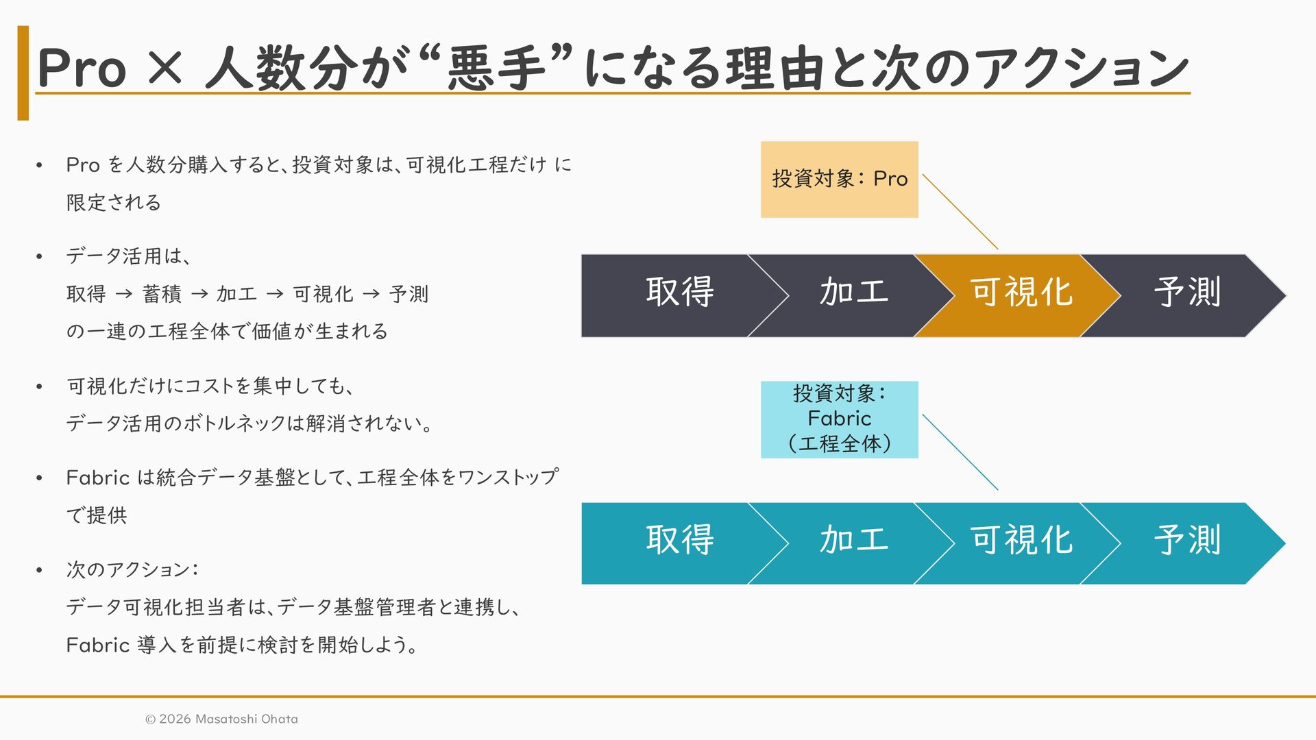 → 加工 → 可視化 → 予測 の一連の工程全体で価値が生まれる • 可視化だけにコストを集中しても、 データ活用のボトルネックは解消されない。 • Fabric は統合データ基盤として、工程全体をワンストップ で提供 • 次のアクション: データ可視化担当者は、データ基盤管理者と連携し、 Fabric 導入を前提に検討を開始しよう。 Pro × 人数分が“悪手”になる理由と次のアクション 取得 加工 可視化 予測 取得 加工 可視化 予測 投資対象: Pro 投資対象: Fabric (工程全体) © 2026 Masatoshi Ohata