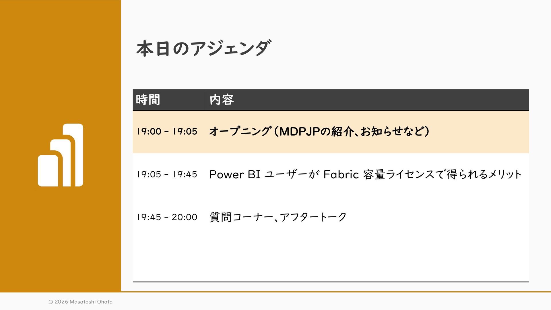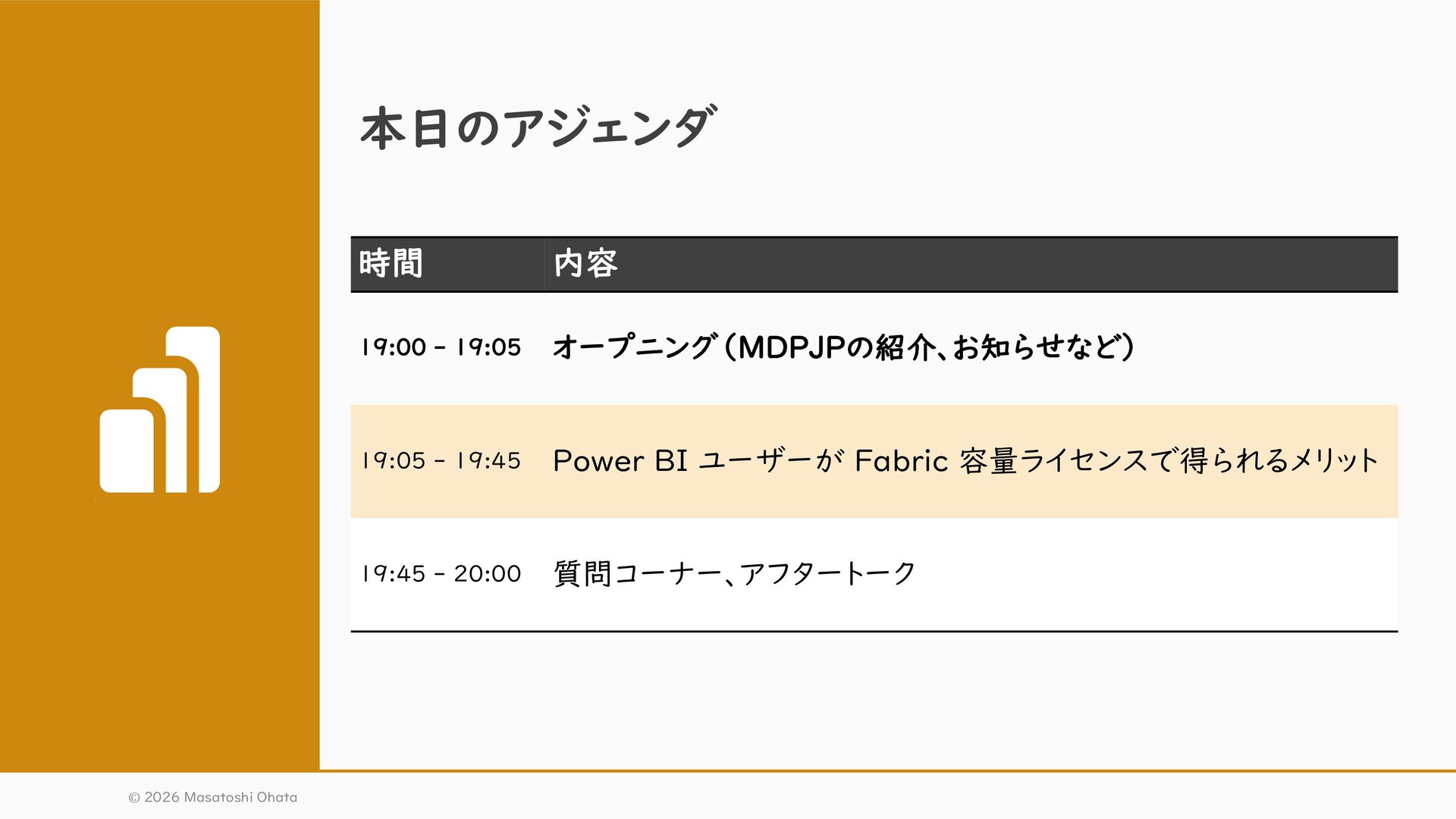 Power BI ユーザーが Fabric 容量ライセンスで得られるメリット 19:45 - 20:00 質問コーナー、アフタートーク © 2026 Masatoshi Ohata