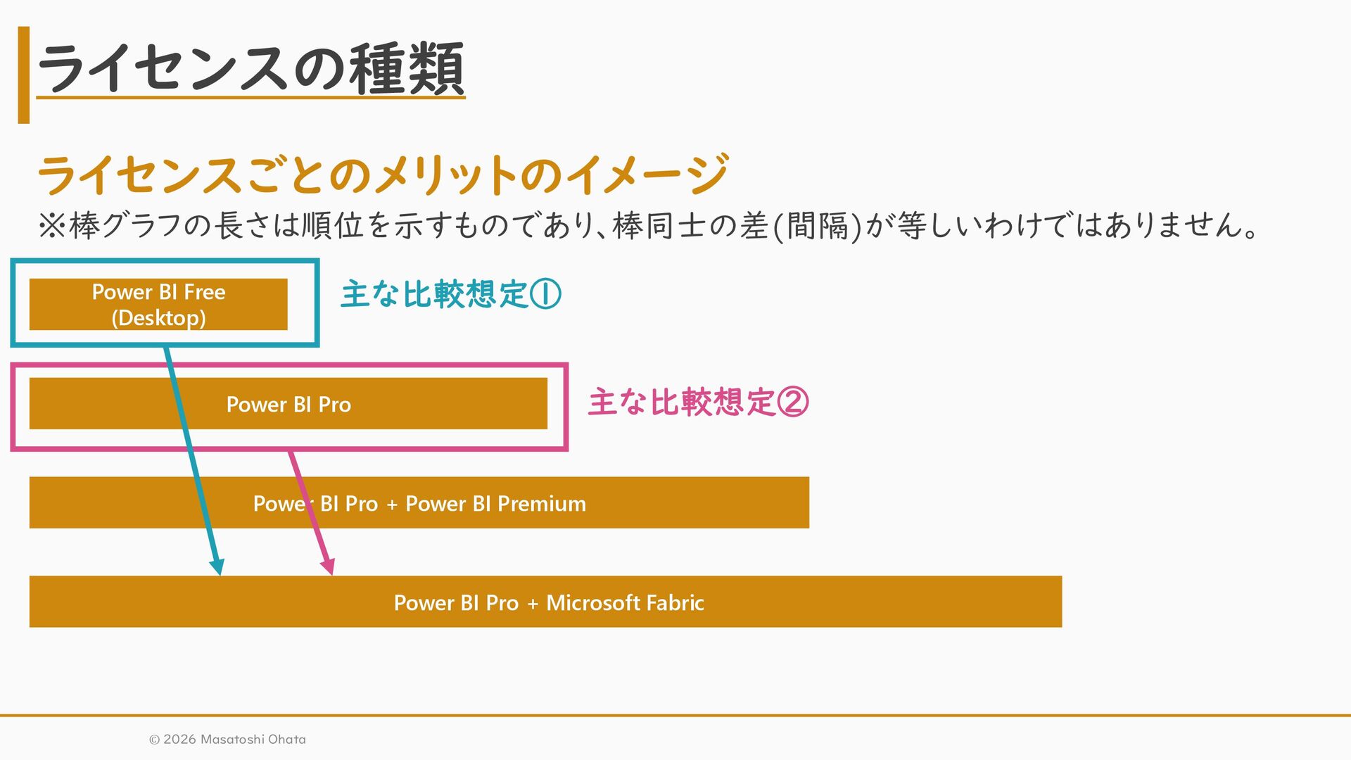 Pro + Power BI Premium Power BI Pro + Microsoft Fabric ライセンスごとのメリットのイメージ ※棒グラフの長さは順位を示すものであり、棒同士の差(間隔)が等しいわけではありません。 © 2026 Masatoshi Ohata