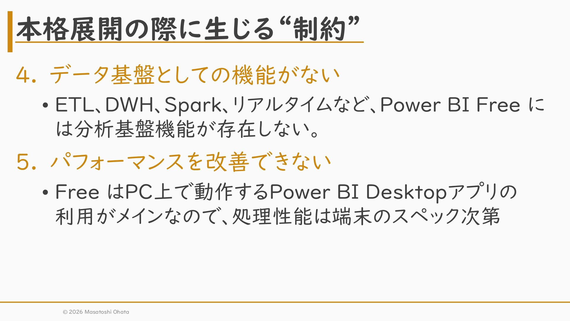 • Free はPC上で動作するPower BI Desktopアプリの 利用がメインなので、処理性能は端末のスペック次第 本格展開の際に生じる“制約” © 2026 Masatoshi Ohata