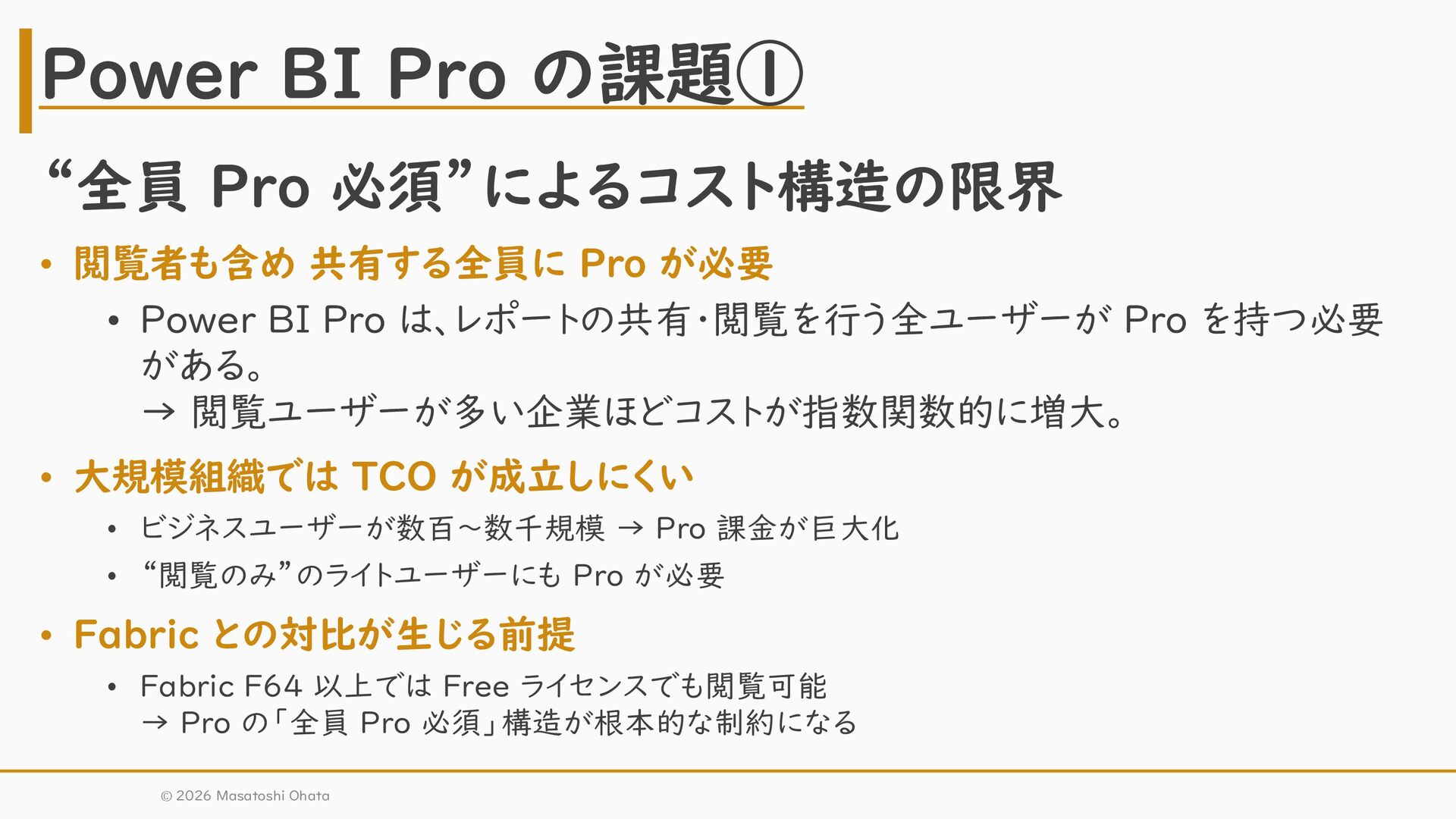 BI Pro は、レポートの共有・閲覧を行う全ユーザーが Pro を持つ必要 がある。 → 閲覧ユーザーが多い企業ほどコストが指数関数的に増大。 • 大規模組織では TCO が成立しにくい • ビジネスユーザーが数百〜数千規模 → Pro 課金が巨大化 • “閲覧のみ”のライトユーザーにも Pro が必要 • Fabric との対比が生じる前提 • Fabric F64 以上では Free ライセンスでも閲覧可能 → Pro の「全員 Pro 必須」構造が根本的な制約になる Power BI Pro の課題① © 2026 Masatoshi Ohata