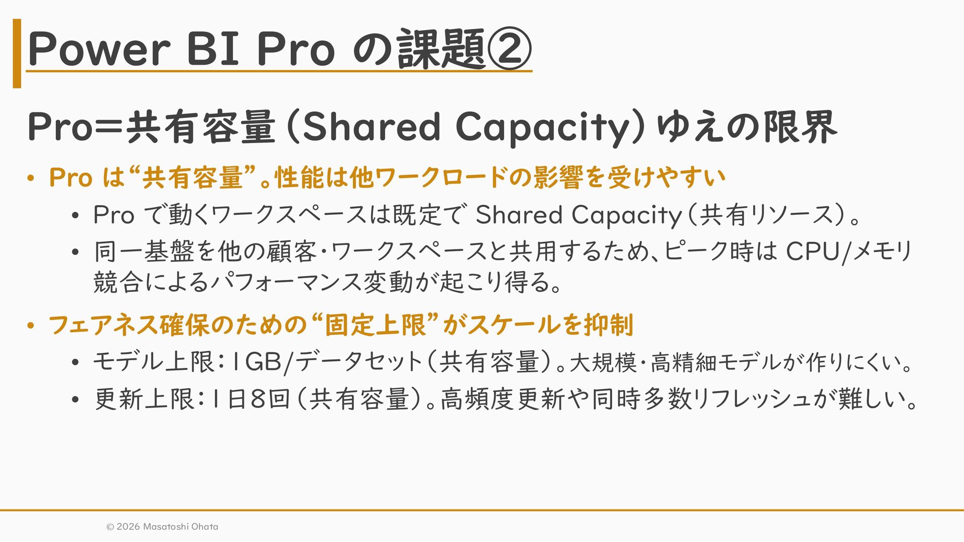 • 同一基盤を他の顧客・ワークスペースと共用するため、ピーク時は CPU/メモリ 競合によるパフォーマンス変動が起こり得る。 • フェアネス確保のための“固定上限”がスケールを抑制 • モデル上限:1GB/データセット(共有容量)。大規模・高精細モデルが作りにくい。 • 更新上限:1日8回(共有容量)。高頻度更新や同時多数リフレッシュが難しい。 Power BI Pro の課題② © 2026 Masatoshi Ohata