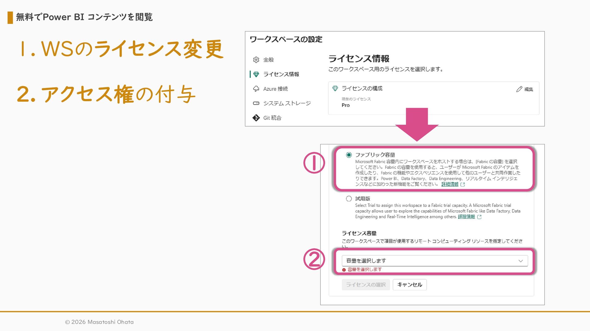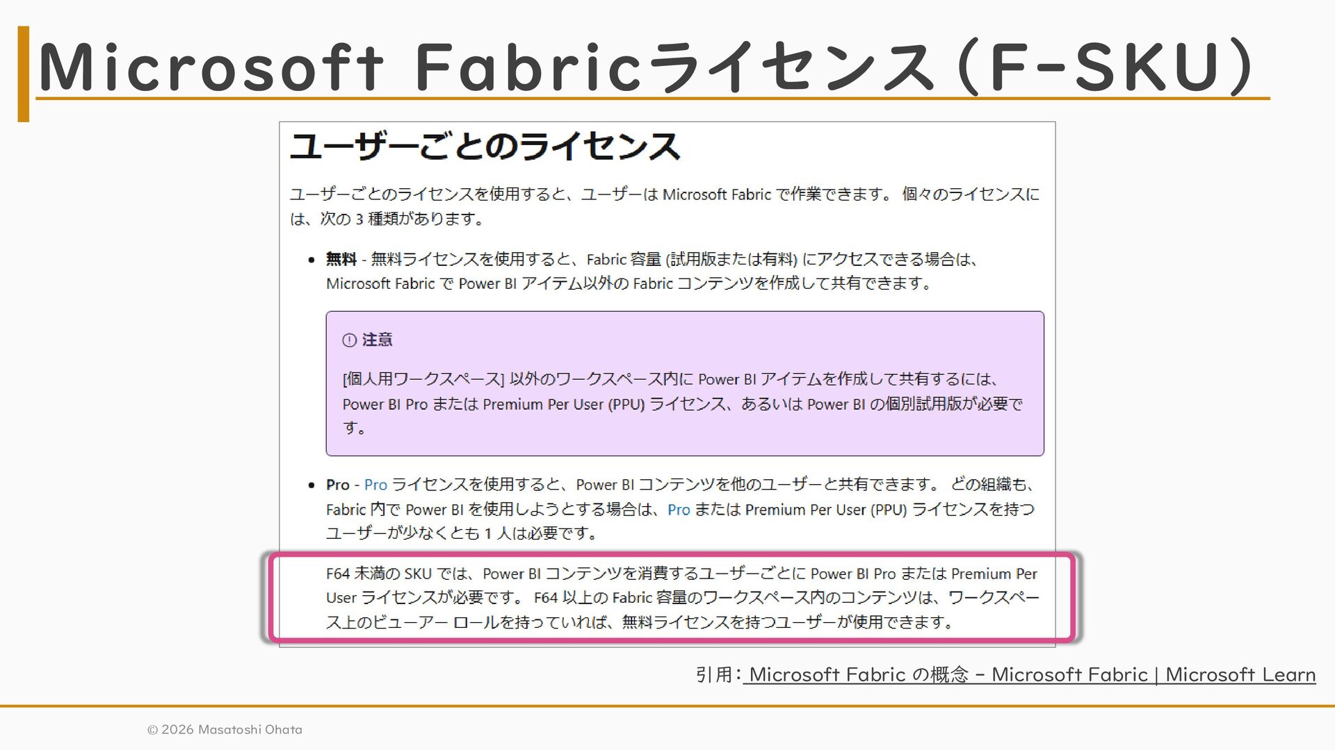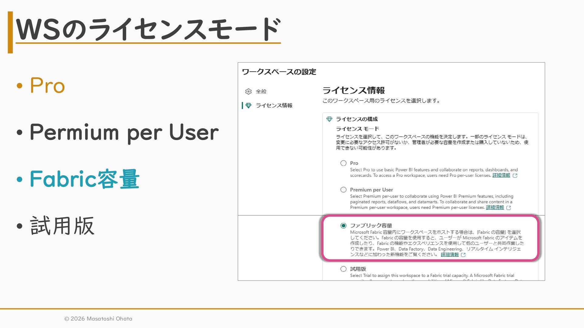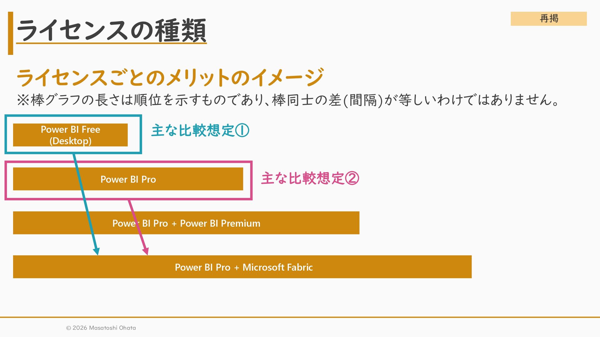 Pro + Power BI Premium Power BI Pro + Microsoft Fabric 主な比較想定① 主な比較想定② ライセンスごとのメリットのイメージ ※棒グラフの長さは順位を示すものであり、棒同士の差(間隔)が等しいわけではありません。 再掲 © 2026 Masatoshi Ohata