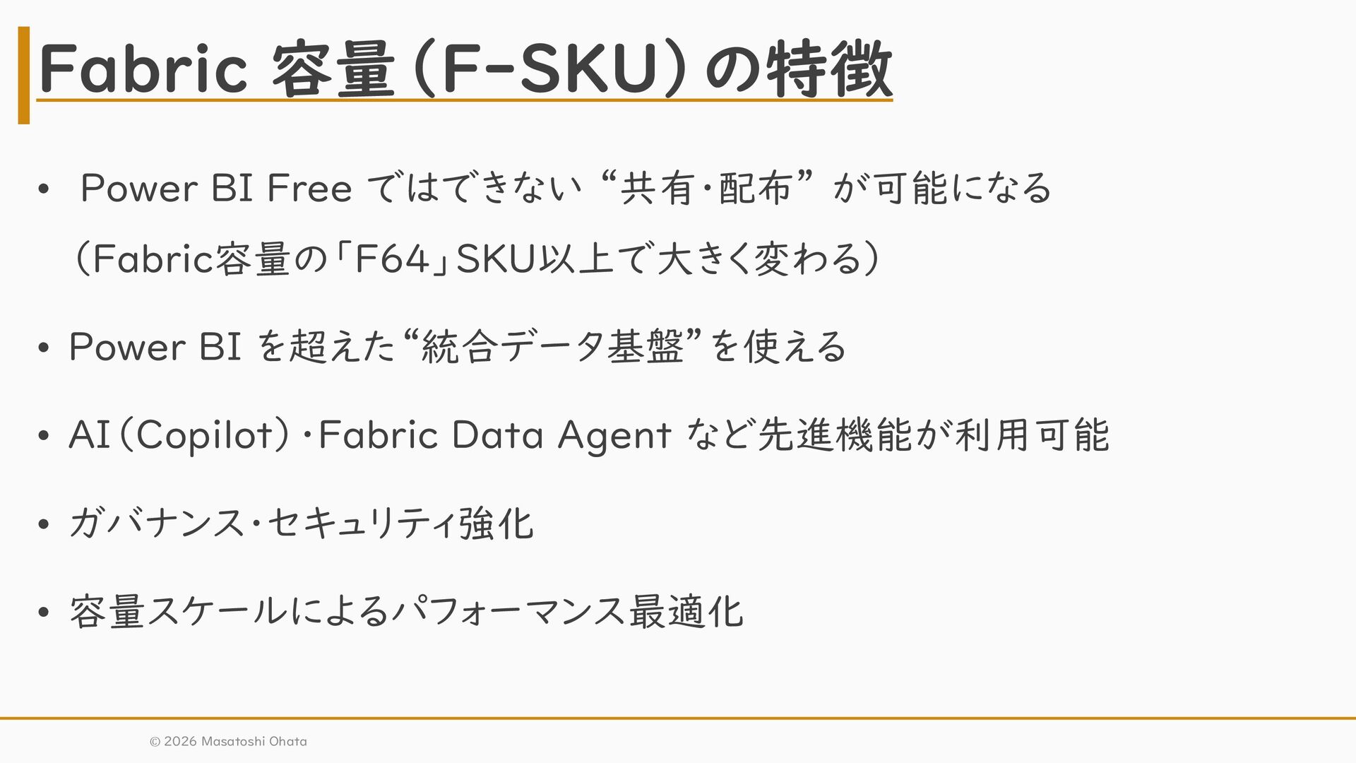 BI を超えた“統合データ基盤”を使える • AI(Copilot)・Fabric Data Agent など先進機能が利用可能 • ガバナンス・セキュリティ強化 • 容量スケールによるパフォーマンス最適化 Fabric 容量(F-SKU)の特徴 © 2026 Masatoshi Ohata