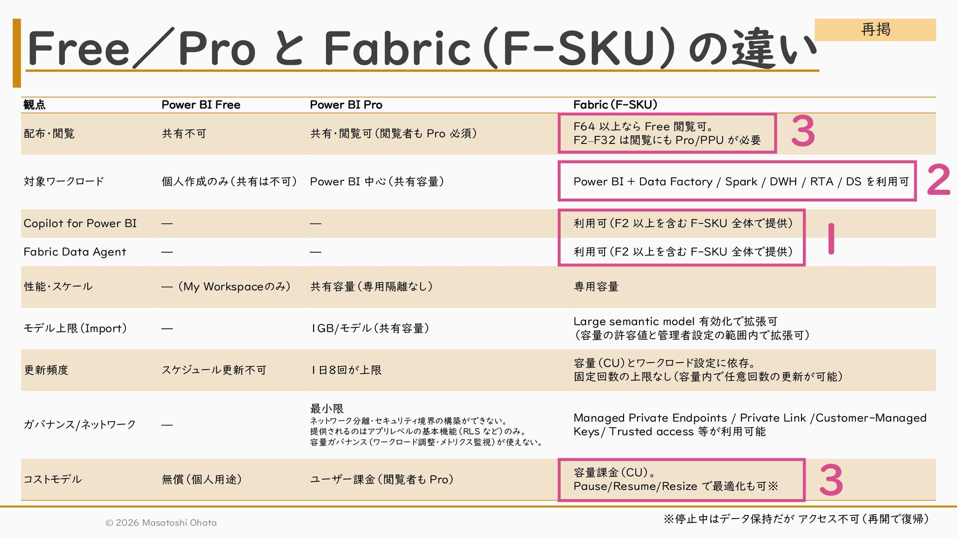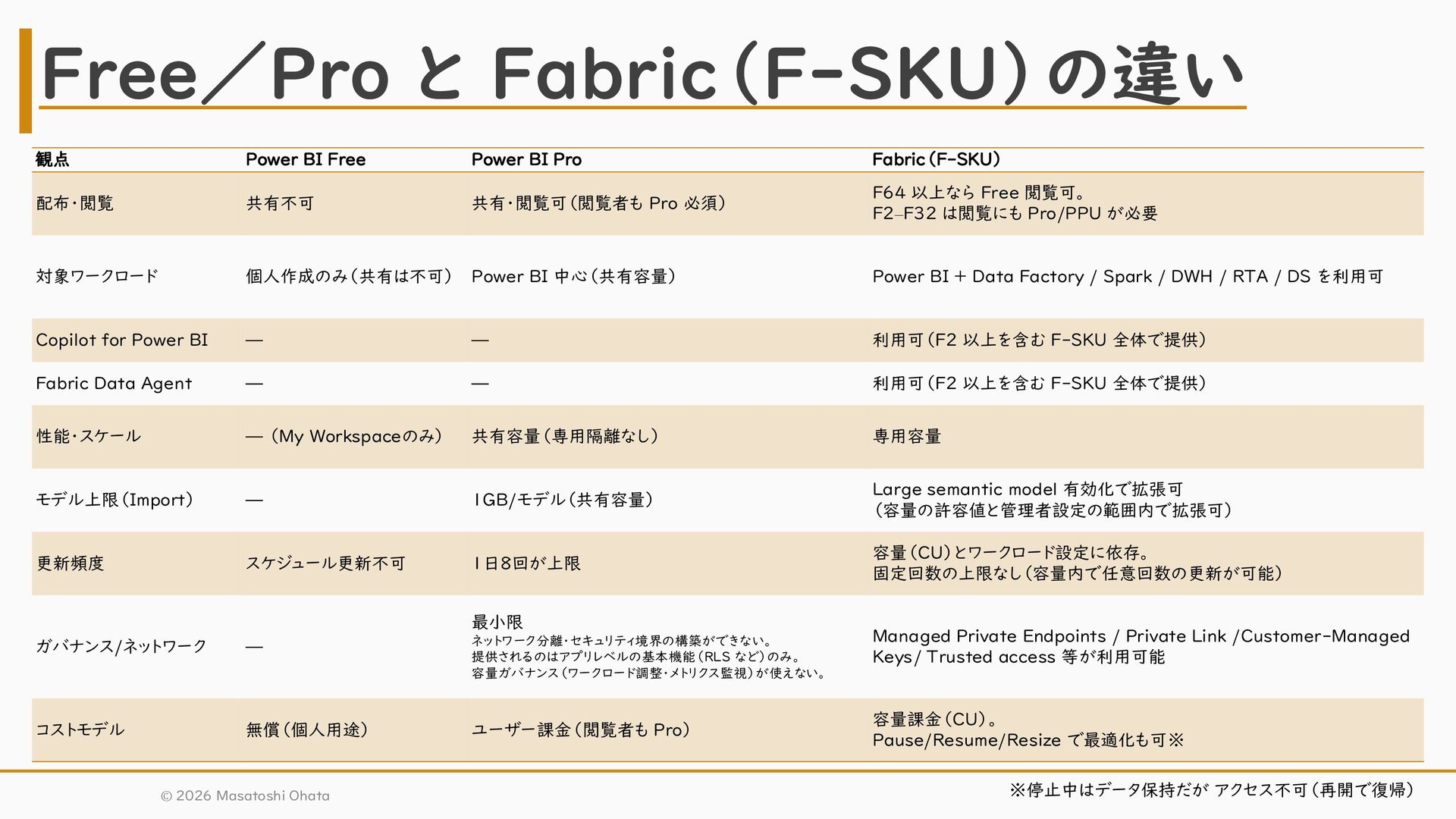 共有・閲覧可(閲覧者も Pro 必須) F64 以上なら Free 閲覧可。 F2–F32 は閲覧にも Pro/PPU が必要 対象ワークロード 個人作成のみ(共有は不可) Power BI 中心(共有容量) Power BI + Data Factory / Spark / DWH / RTA / DS を利用可 Copilot for Power BI — — 利用可(F2 以上を含む F-SKU 全体で提供) Fabric Data Agent — — 利用可(F2 以上を含む F-SKU 全体で提供) 性能・スケール — (My Workspaceのみ) 共有容量(専用隔離なし) 専用容量 モデル上限(Import) — 1GB/モデル(共有容量) Large semantic model 有効化で拡張可 (容量の許容値と管理者設定の範囲内で拡張可) 更新頻度 スケジュール更新不可 1日8回が上限 容量(CU)とワークロード設定に依存。 固定回数の上限なし(容量内で任意回数の更新が可能) ガバナンス/ネットワーク — 最小限 ネットワーク分離・セキュリティ境界の構築ができない。 提供されるのはアプリレベルの基本機能(RLS など)のみ。 容量ガバナンス(ワークロード調整・メトリクス監視)が使えない。 Managed Private Endpoints / Private Link /Customer-Managed Keys/ Trusted access 等が利用可能 コストモデル 無償(個人用途) ユーザー課金(閲覧者も Pro) 容量課金(CU)。 Pause/Resume/Resize で最適化も可※ Free/Pro と Fabric(F-SKU)の違い ※停止中はデータ保持だが アクセス不可(再開で復帰) © 2026 Masatoshi Ohata