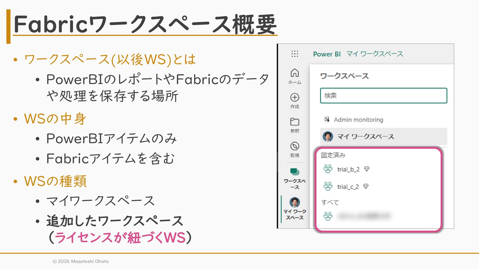 Fabricアイテムを含む • WSの種類 • マイワークスペース • 追加したワークスペース (ライセンスが紐づくWS) © 2026 Masatoshi Ohata Fabricワークスペース概要