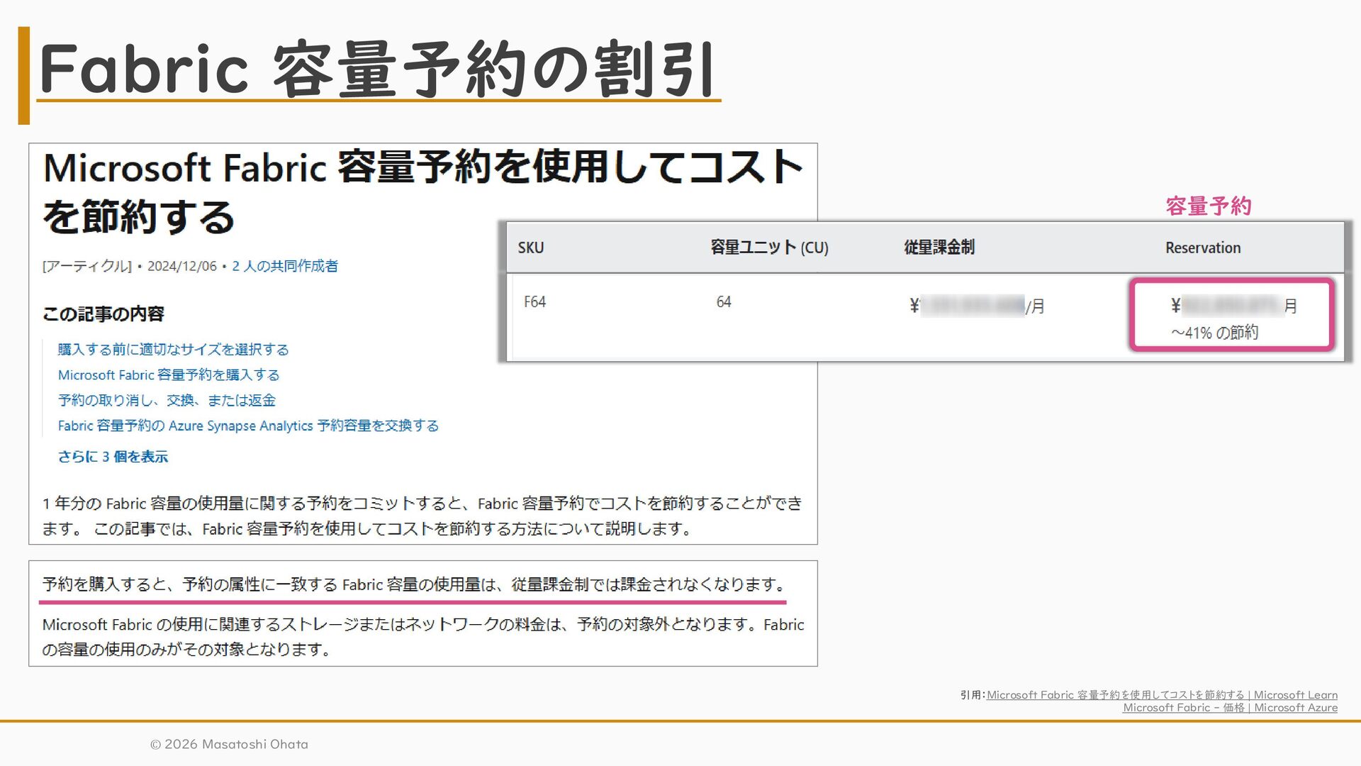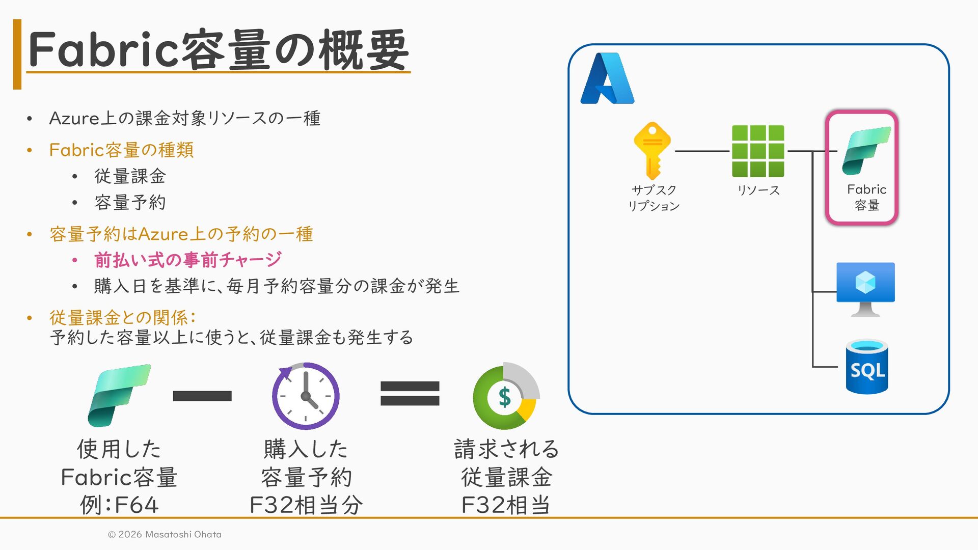 • 前払い式の事前チャージ • 購入日を基準に、毎月予約容量分の課金が発生 • 従量課金との関係: 予約した容量以上に使うと、従量課金も発生する © 2026 Masatoshi Ohata Fabric容量の概要 サブスク リプション リソース Fabric 容量 使用した Fabric容量 例:F64 購入した 容量予約 F32相当分 請求される 従量課金 F32相当