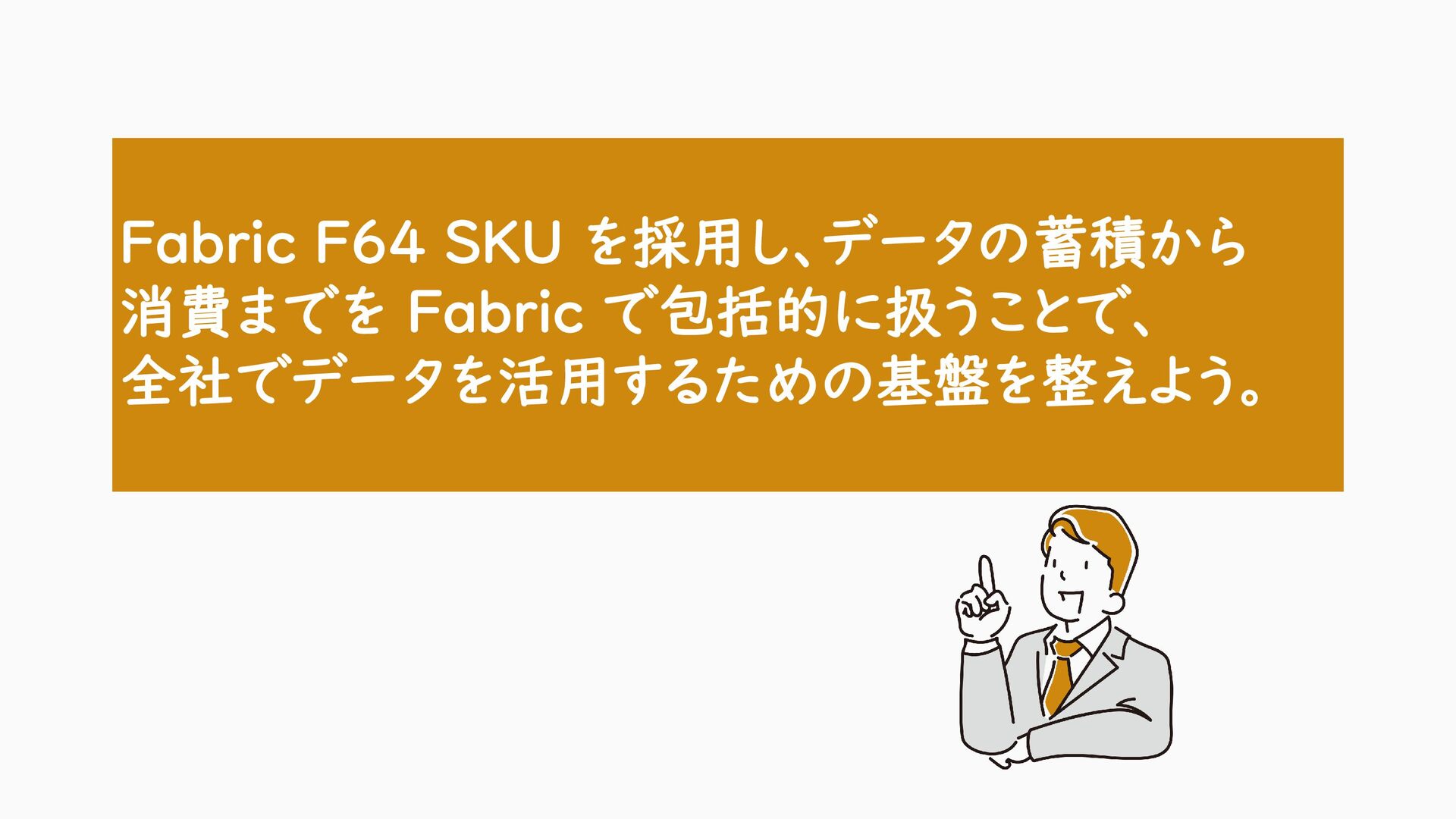 31. • データの「ETL」と「保管場所」を Fabric に統合し、コストを一本化する。 • これまで Fabric 以外に分散して発生していた費用を、Fabric の容量コストにまとめ ることで、「F64」SKU