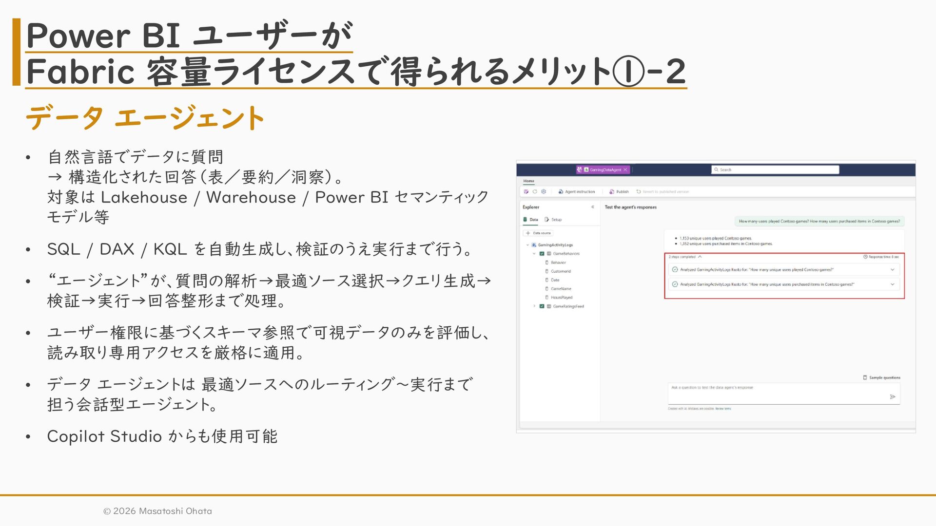 / Power BI セマンティック モデル等 • SQL / DAX / KQL を自動生成し、検証のうえ実行まで行う。 • “エージェント”が、質問の解析→最適ソース選択→クエリ生成→ 検証→実行→回答整形まで処理。 • ユーザー権限に基づくスキーマ参照で可視データのみを評価し、 読み取り専用アクセスを厳格に適用。 • データ エージェントは 最適ソースへのルーティング~実行まで 担う会話型エージェント。 • Copilot Studio からも使用可能 Power BI ユーザーが Fabric 容量ライセンスで得られるメリット①-2 © 2026 Masatoshi Ohata