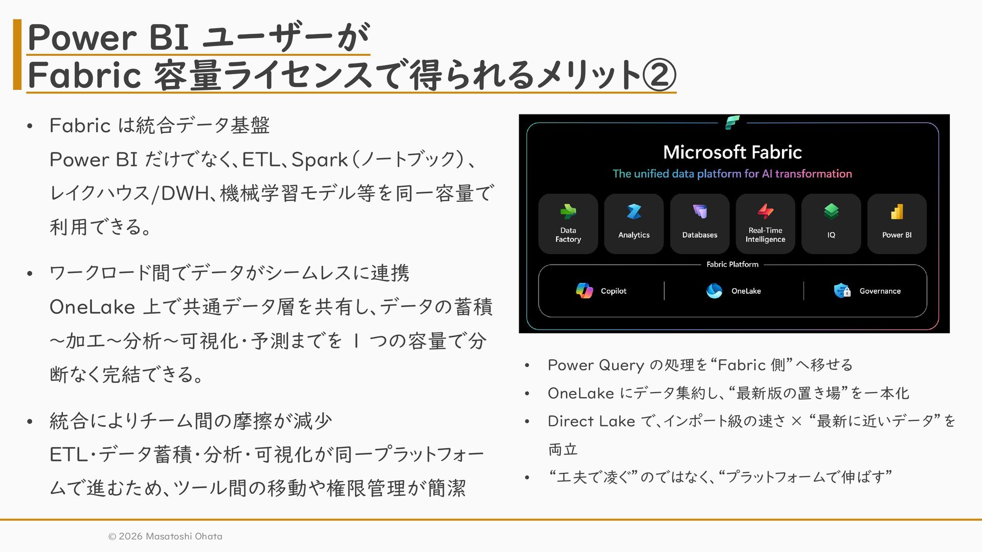 OneLake 上で共通データ層を共有し、データの蓄積 〜加工〜分析〜可視化・予測までを 1 つの容量で分 断なく完結できる。 • 統合によりチーム間の摩擦が減少 ETL・データ蓄積・分析・可視化が同一プラットフォー ムで進むため、ツール間の移動や権限管理が簡潔 Power BI ユーザーが Fabric 容量ライセンスで得られるメリット② • Power Query の処理を“Fabric 側”へ移せる • OneLake にデータ集約し、“最新版の置き場”を一本化 • Direct Lake で、インポート級の速さ × “最新に近いデータ”を 両立 • “工夫で凌ぐ”のではなく、“プラットフォームで伸ばす” © 2026 Masatoshi Ohata