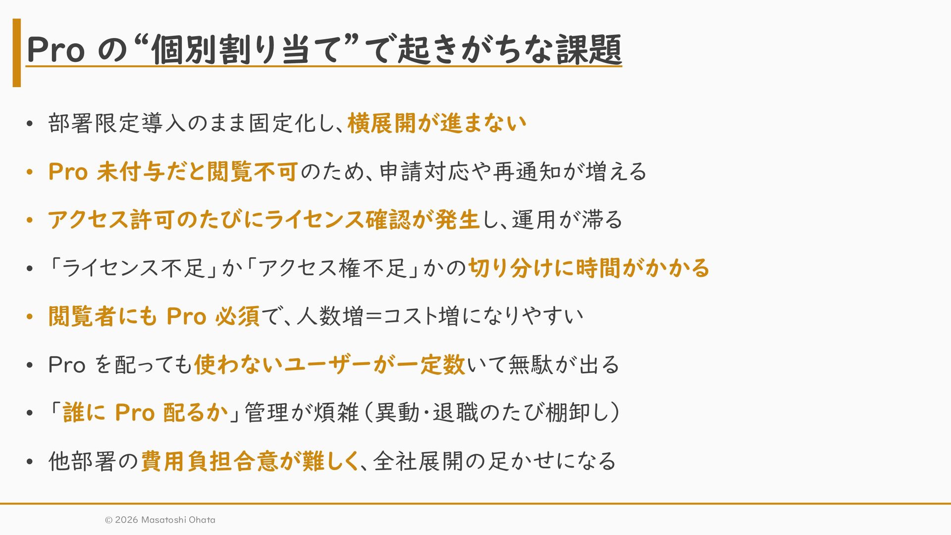 閲覧者にも Pro 必須で、人数増=コスト増になりやすい • Pro を配っても使わないユーザーが一定数いて無駄が出る • 「誰に Pro 配るか」管理が煩雑(異動・退職のたび棚卸し) • 他部署の費用負担合意が難しく、全社展開の足かせになる Pro の“個別割り当て”で起きがちな課題 © 2026 Masatoshi Ohata