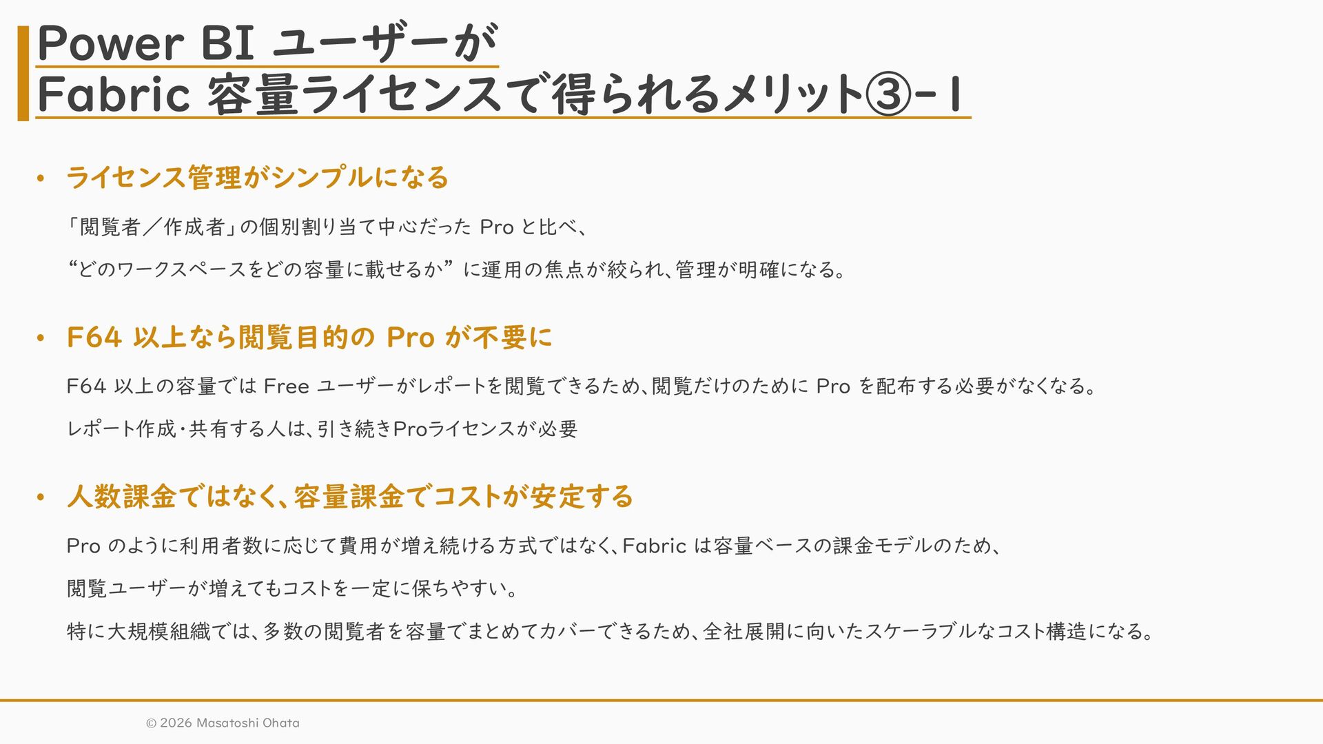 Pro が不要に F64 以上の容量では Free ユーザーがレポートを閲覧できるため、閲覧だけのために Pro を配布する必要がなくなる。 レポート作成・共有する人は、引き続きProライセンスが必要 • 人数課金ではなく、容量課金でコストが安定する Pro のように利用者数に応じて費用が増え続ける方式ではなく、Fabric は容量ベースの課金モデルのため、 閲覧ユーザーが増えてもコストを一定に保ちやすい。 特に大規模組織では、多数の閲覧者を容量でまとめてカバーできるため、全社展開に向いたスケーラブルなコスト構造になる。 Power BI ユーザーが Fabric 容量ライセンスで得られるメリット③-1 © 2026 Masatoshi Ohata