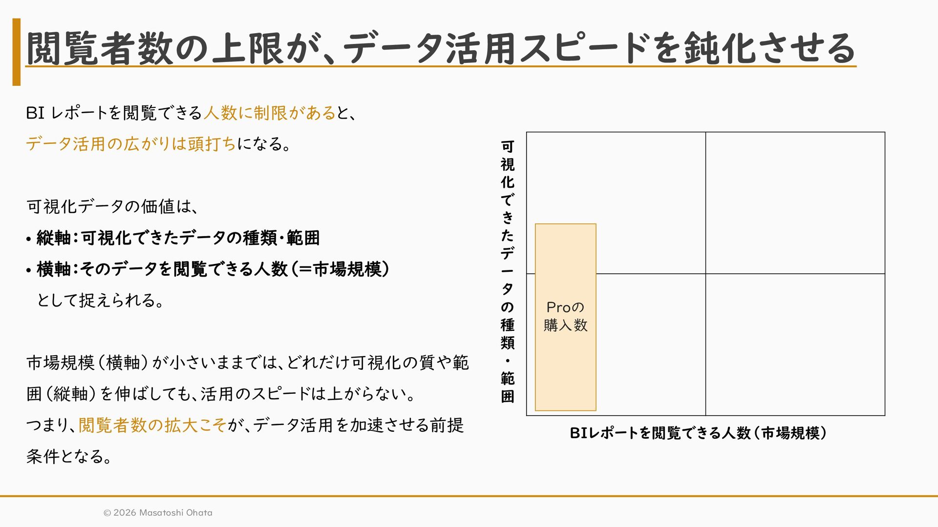 タ の 種 類 ・ 範 囲 BI レポートを閲覧できる人数に制限があると、 データ活用の広がりは頭打ちになる。 可視化データの価値は、 • 縦軸:可視化できたデータの種類・範囲 • 横軸:そのデータを閲覧できる人数(=市場規模) として捉えられる。 市場規模(横軸)が小さいままでは、どれだけ可視化の質や範 囲(縦軸)を伸ばしても、活用のスピードは上がらない。 つまり、閲覧者数の拡大こそが、データ活用を加速させる前提 条件となる。 Proの 購入数 © 2026 Masatoshi Ohata