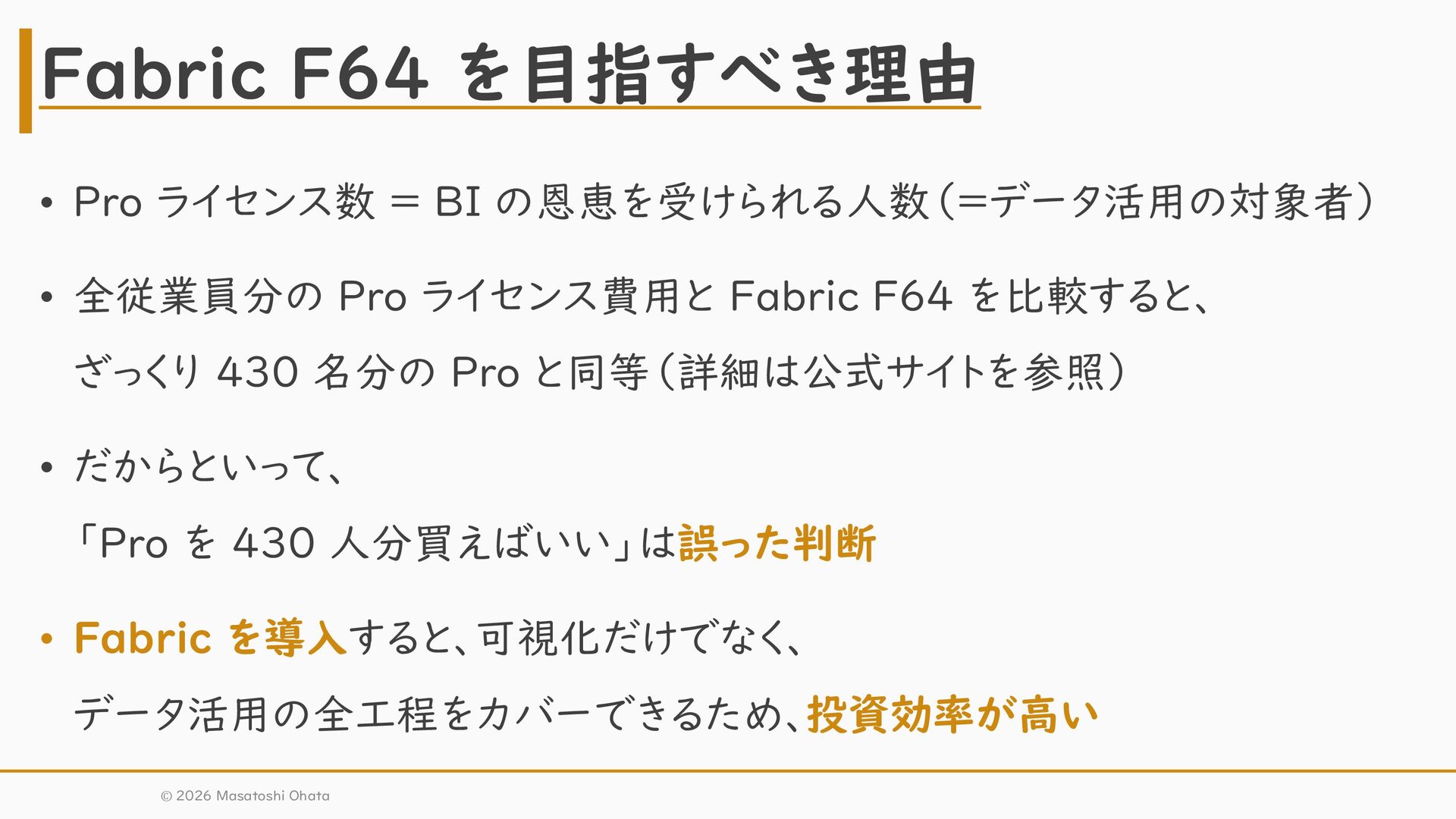 Fabric F64 を比較すると、 ざっくり 430 名分の Pro と同等(詳細は公式サイトを参照) • だからといって、 「Pro を 430 人分買えばいい」は誤った判断 • Fabric を導入すると、可視化だけでなく、 データ活用の全工程をカバーできるため、投資効率が高い Fabric F64 を目指すべき理由 © 2026 Masatoshi Ohata