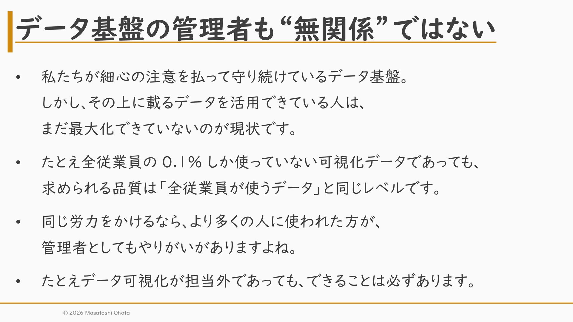 同じ労力をかけるなら、より多くの人に使われた方が、 管理者としてもやりがいがありますよね。 • たとえデータ可視化が担当外であっても、できることは必ずあります。 データ基盤の管理者も“無関係”ではない © 2026 Masatoshi Ohata