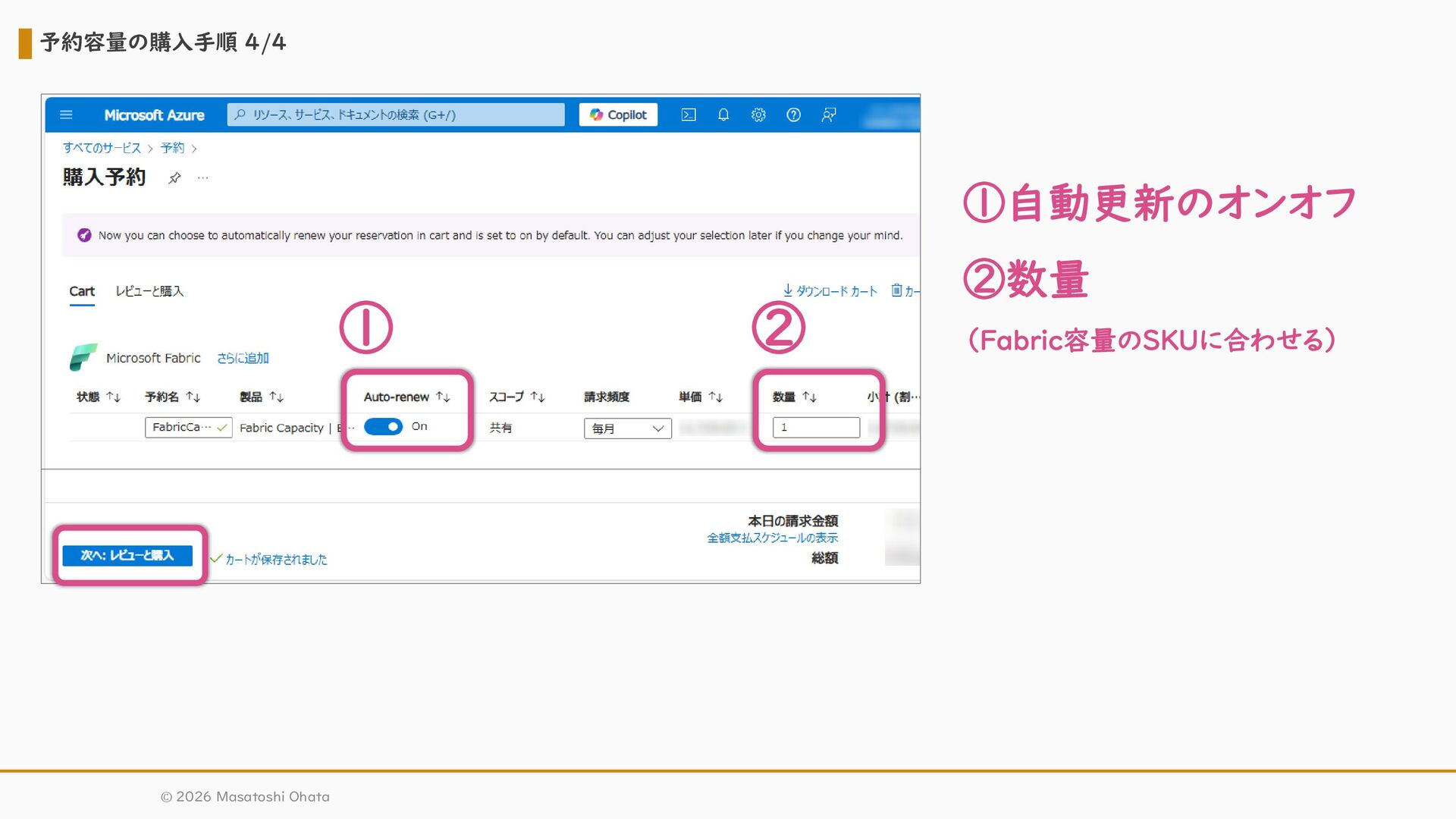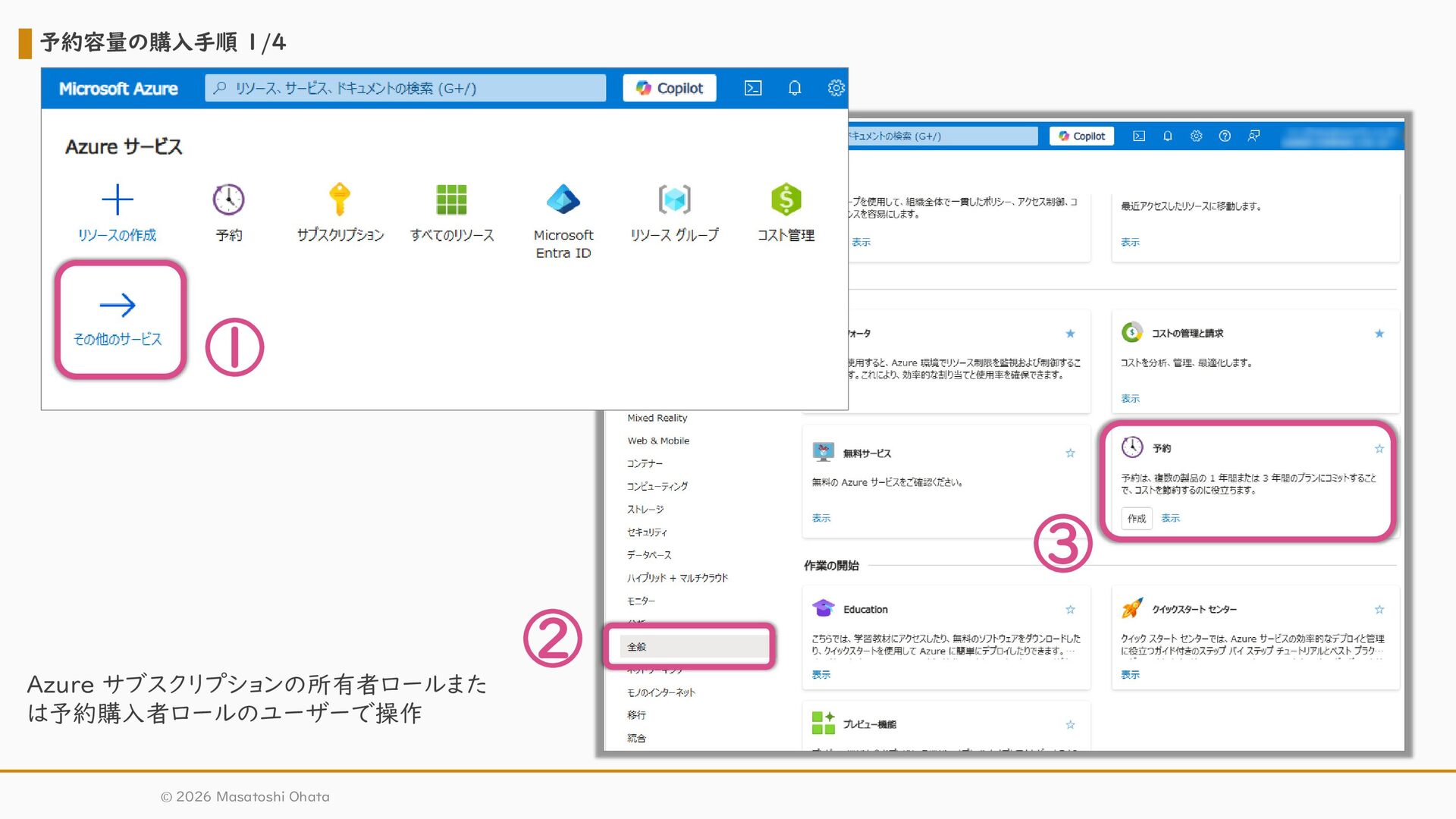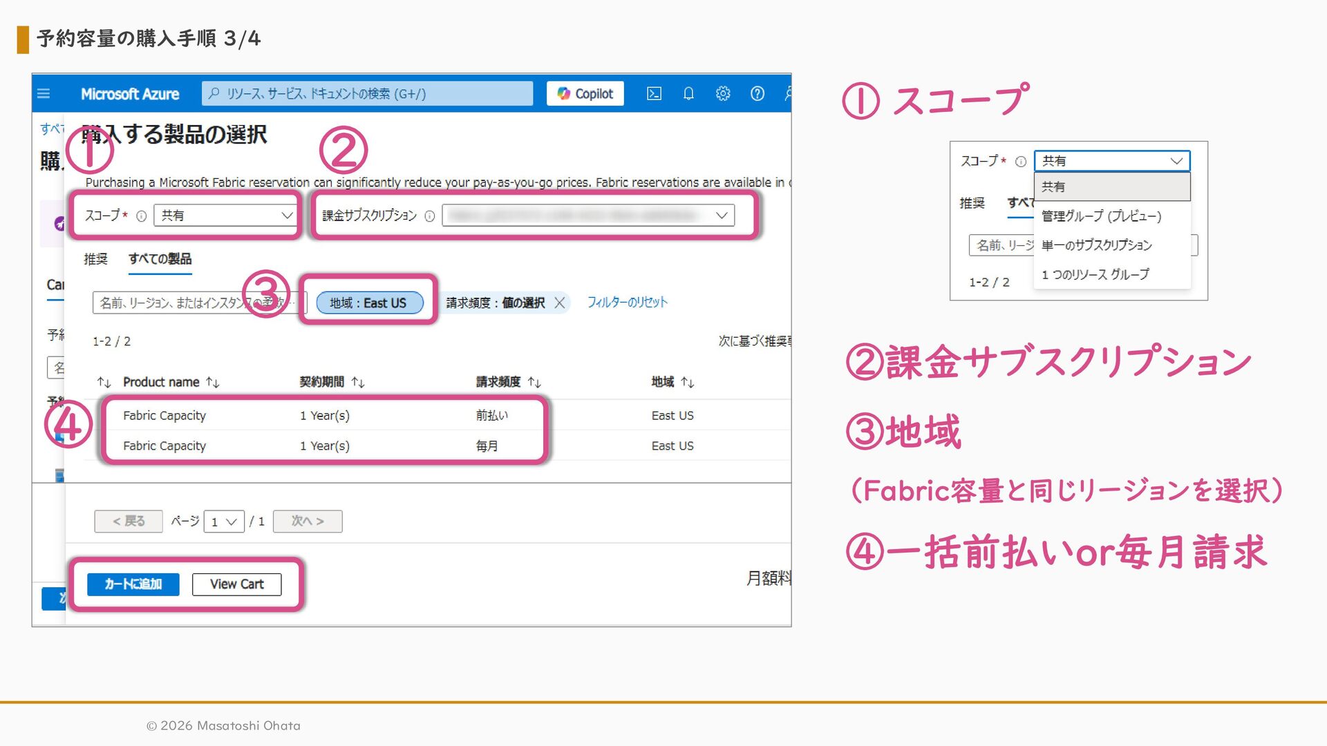 32. 予約容量の購入手順 3/4 © 2026 Masatoshi Ohata ① スコープ ②課金サブスクリプション ③地域