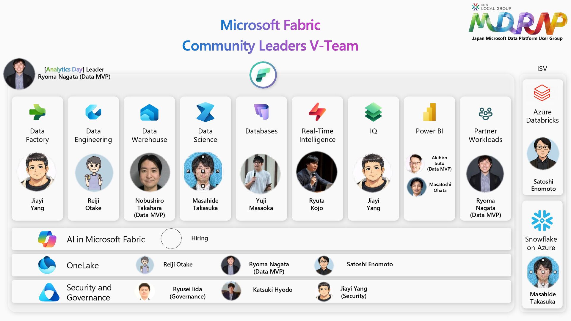 Data Factory Data Engineering Data Warehouse Data Science Databases Real-Time Intelligence IQ Power BI Partner Workloads Security and Governance Yuji Masaoka Masahide Takasuka Ryuta Kojo Reiji Otake Jiayi Yang Nobushiro Takahara (Data MVP) Jiayi Yang Akihiro Suto (Data MVP) Ryoma Nagata (Data MVP) Ryusei Iida (Governance) [Analytics Day] Leader Ryoma Nagata (Data MVP) Jiayi Yang (Security) Reiji Otake Ryoma Nagata (Data MVP) Hiring Azure Databricks Satoshi Enomoto Snowflake on Azure Masahide Takasuka ISV Satoshi Enomoto Katsuki Hyodo Masatoshi Ohata