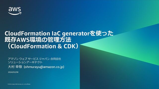 ) アマゾン ウェブ サービス ジャパン 合同会社 ソリューションアーキテクト CloudFormation IaC generatorを使った 既存AWS環境の管理⽅法 (CloudFormation & CDK) 2024/02/08