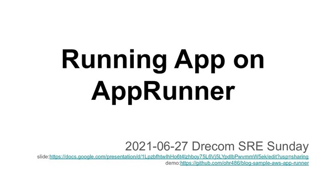 Running App on AppRunner 2021-06-27 Drecom SRE Sunday slide:https://docs.google.com/presentation/d/1LpzbfhtwIhHo6t4lzhboy75L6Vj5LYpdlbPwvmmW5ek/edit?usp=sharing demo:https://github.com/ohr486/blog-sample-aws-app-runner