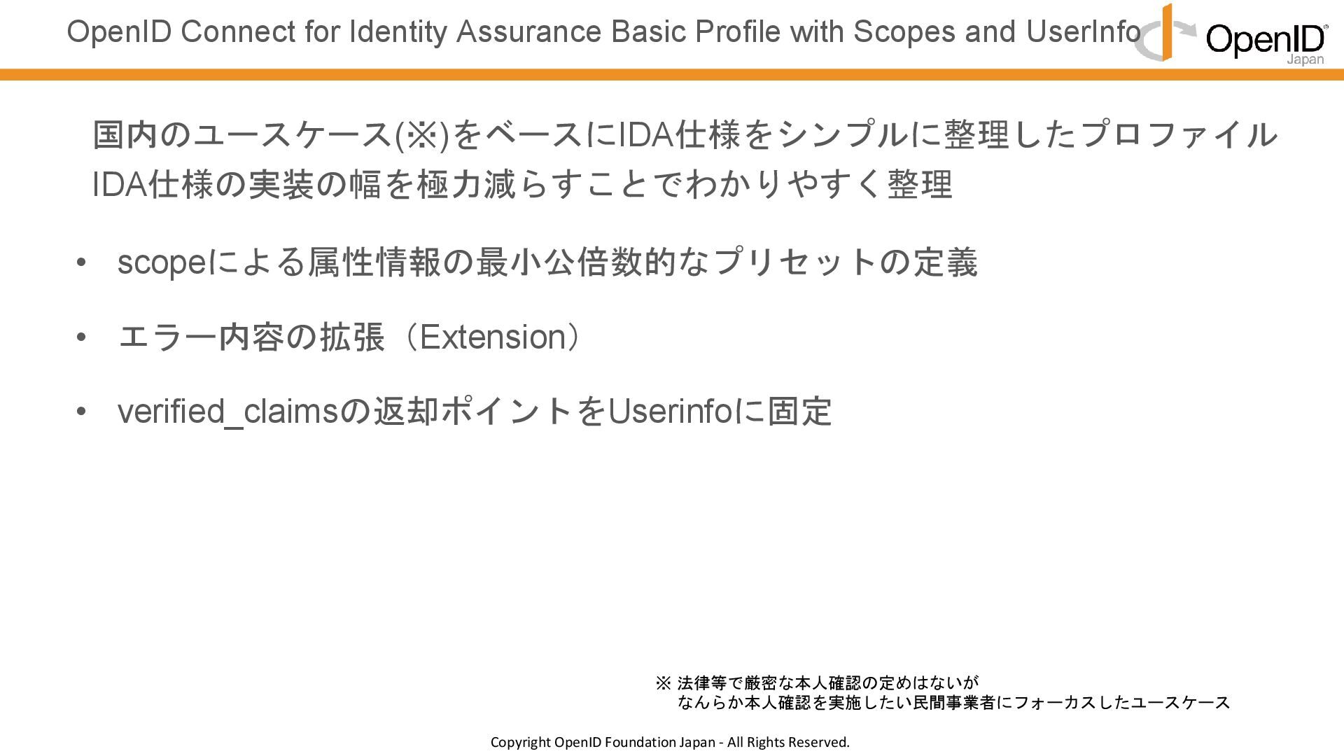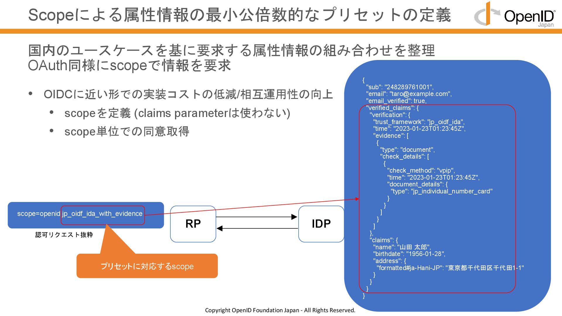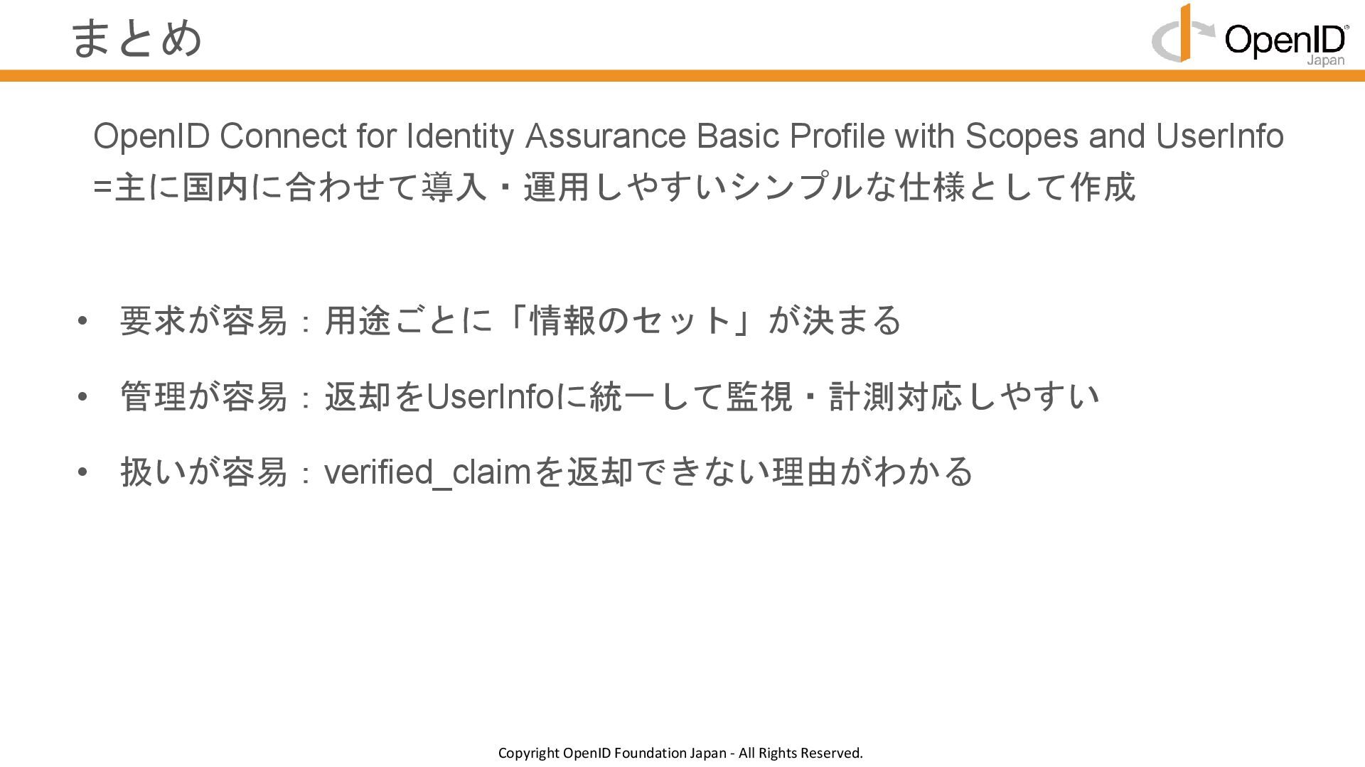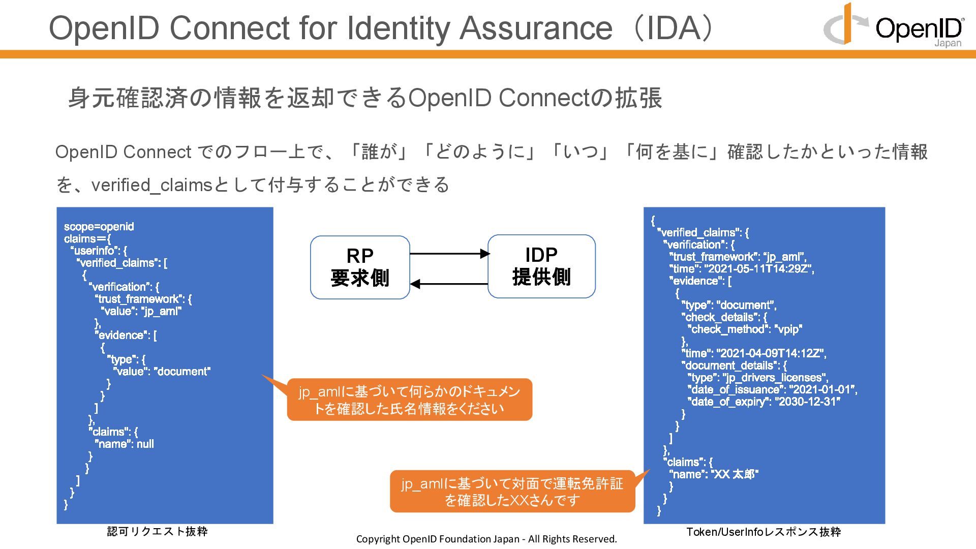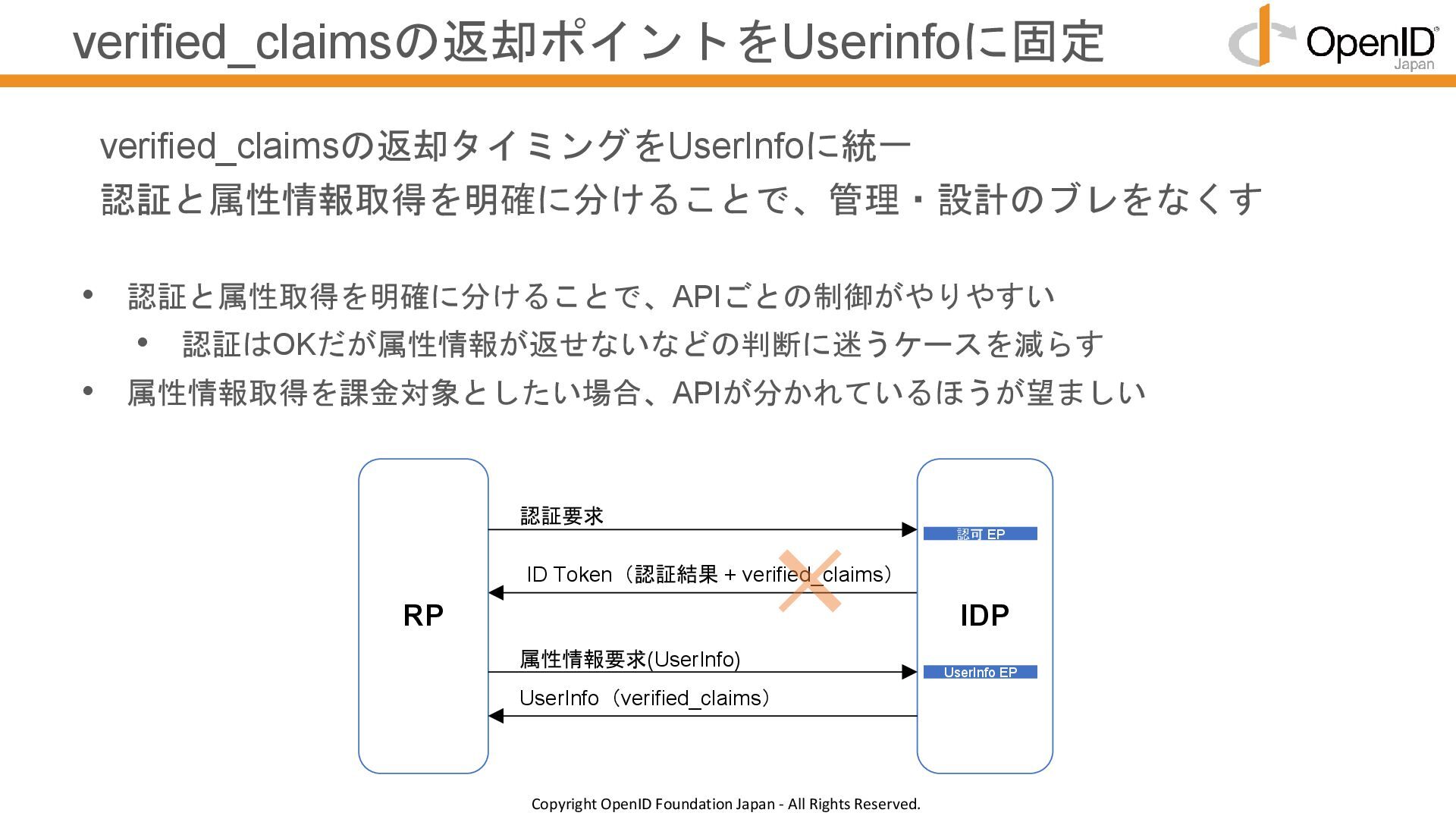 認証と属性取得を明確に分けることで、APIごとの制御がやりやすい • 認証はOKだが属性情報が返せないなどの判断に迷うケースを減らす • 属性情報取得を課金対象としたい場合、APIが分かれているほうが望ましい verified_claimsの返却タイミングをUserInfoに統一 認証と属性情報取得を明確に分けることで、管理・設計のブレをなくす RP IDP ID Token(認証結果 + verified_claims) 認証要求 UserInfo(verified_claims) 属性情報要求(UserInfo) UserInfo EP 認可 EP