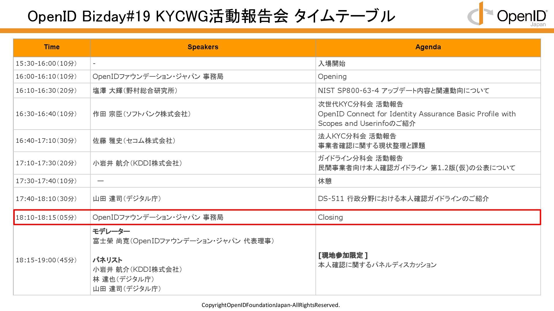 CopyrightOpenIDFoundationJapan-AllRightsReserved. OpenID Bizday#19 KYCWG活動報告会 タイムテーブル Time Speakers Agenda 15:30-16:00(10分) -