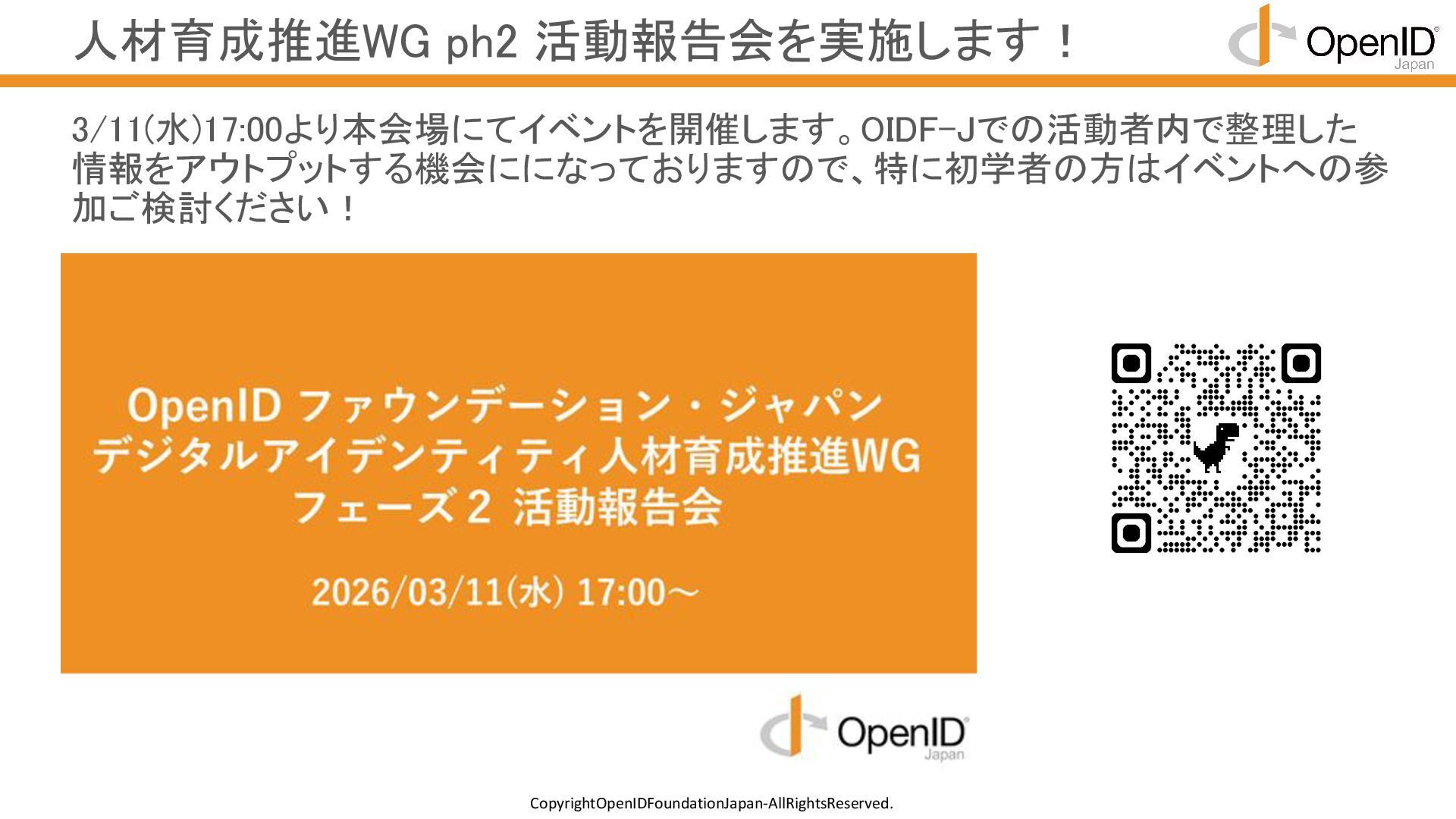 CopyrightOpenIDFoundationJapan-AllRightsReserved. 人材育成推進WG ph2 活動報告会を実施します! 3/11(水)17:00より本会場にてイベントを開催します。OIDF-Jでの活動者内で整理した 情報をアウトプットする機会にになっておりますので、特に初学者の方はイベントへの参 加ご検討ください!