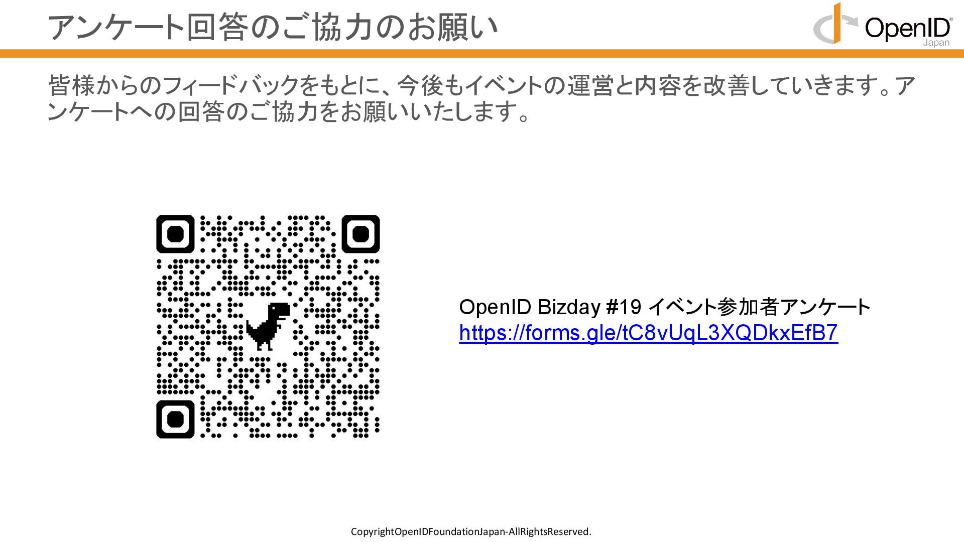 CopyrightOpenIDFoundationJapan-AllRightsReserved. アンケート回答のご協力のお願い 皆様からのフィードバックをもとに、今後もイベントの運営と内容を改善していきます。ア ンケートへの回答のご協力をお願いいたします。 OpenID Bizday #19 イベント参加者アンケート https://forms.gle/tC8vUqL3XQDkxEfB7