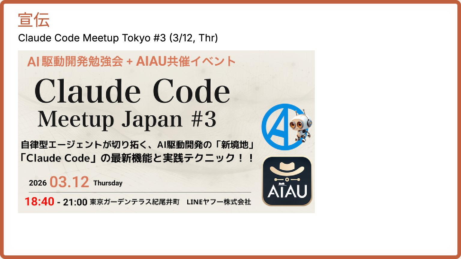 Claude Codeの進化~Oikonさんと学ぶ、各機能の活かし方~(Findyさま): https://findy.connpass.com/event/385245/