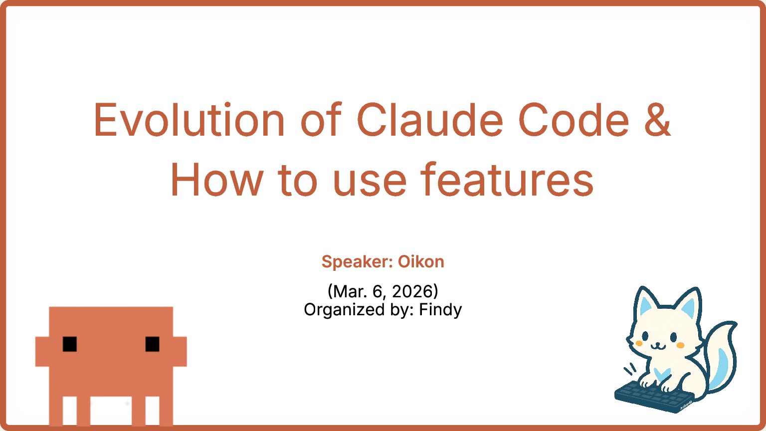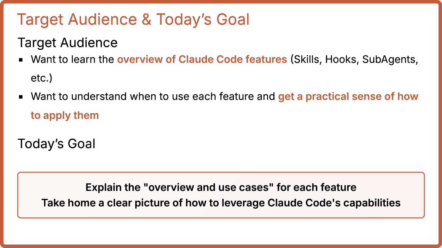the overview of Claude Code features (Skills, Hooks, SubAgents, etc.) Want to understand when to use each feature and get a practical sense of how to apply them Today’s Goal Explain the "overview and use cases" for each feature Take home a clear picture of how to leverage Claude Code's capabilities