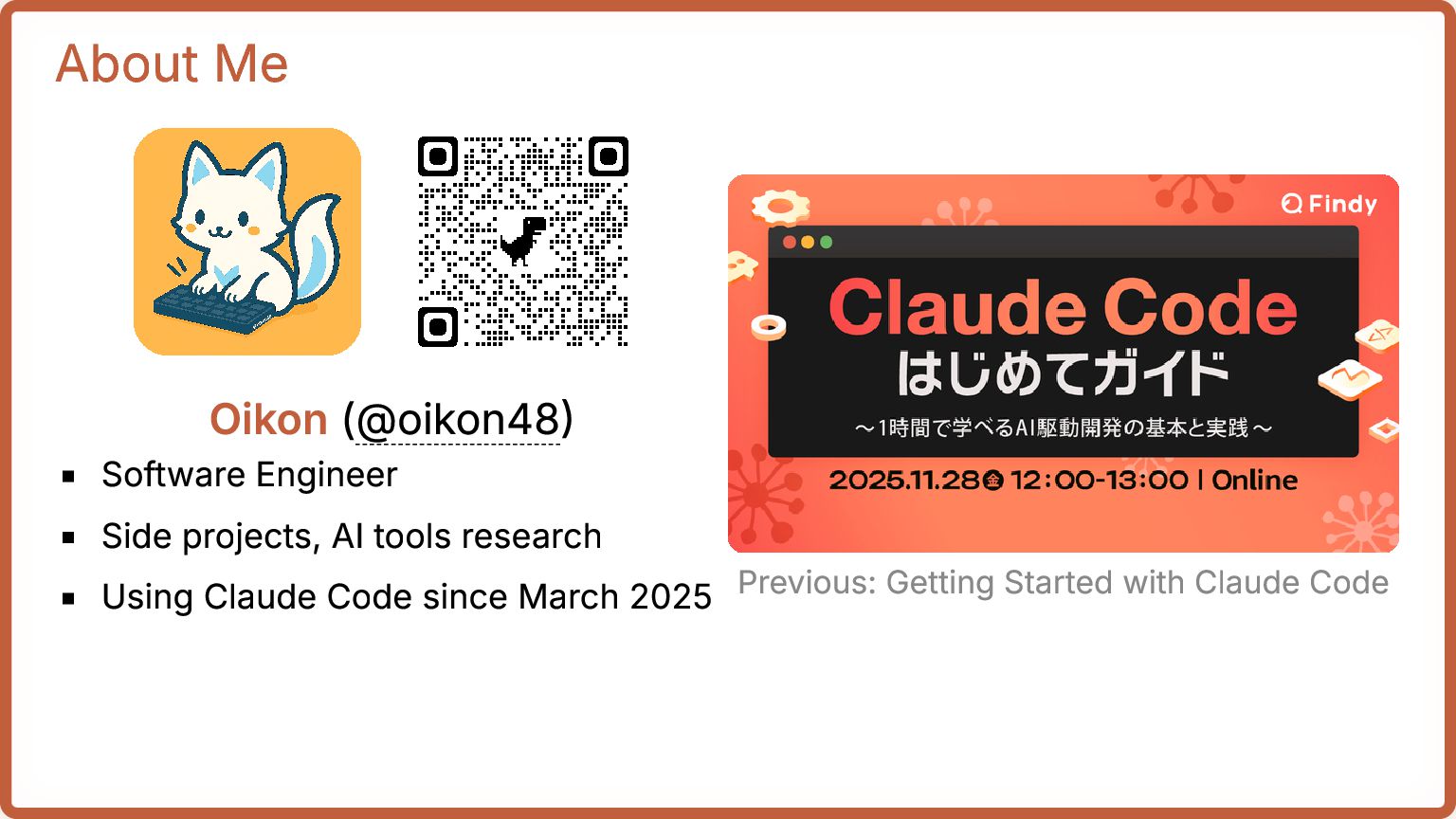 2. About Me Oikon (@oikon48) Software Engineer Side projects, AI tools