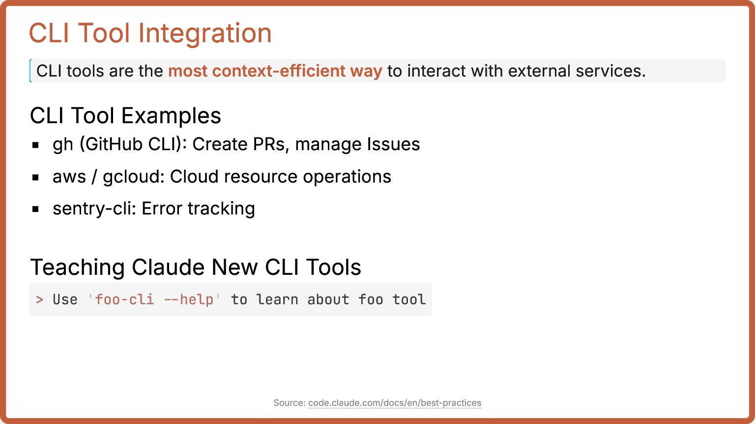 10. CLI Tool Integration CLI tools are the most context-efficient way