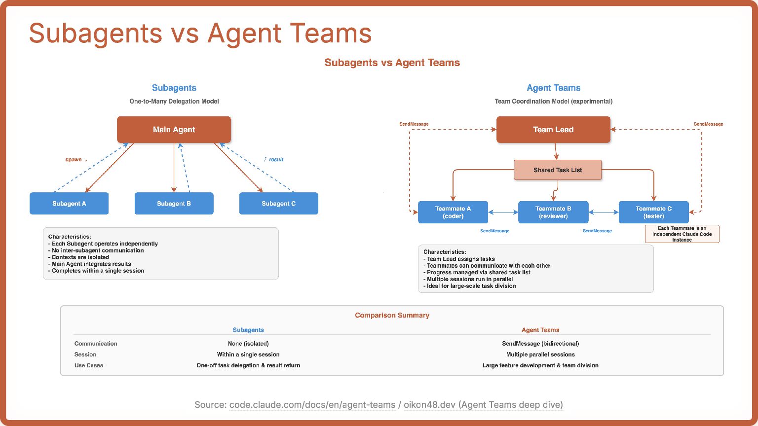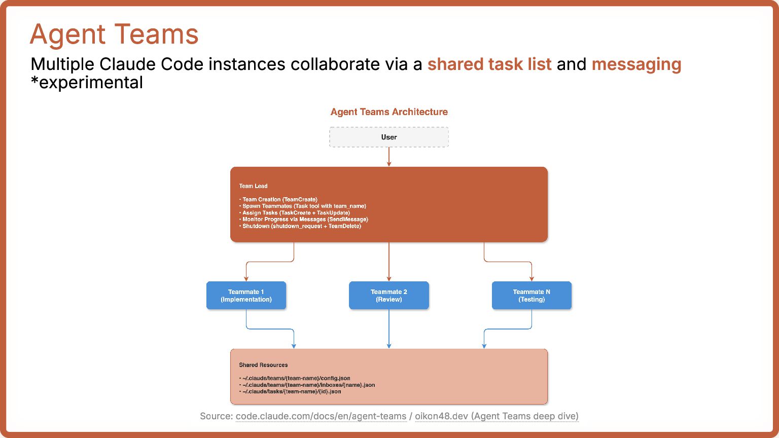 task list and messaging *experimental Source: code.claude.com/docs/en/agent-teams / oikon48.dev (Agent Teams deep dive)