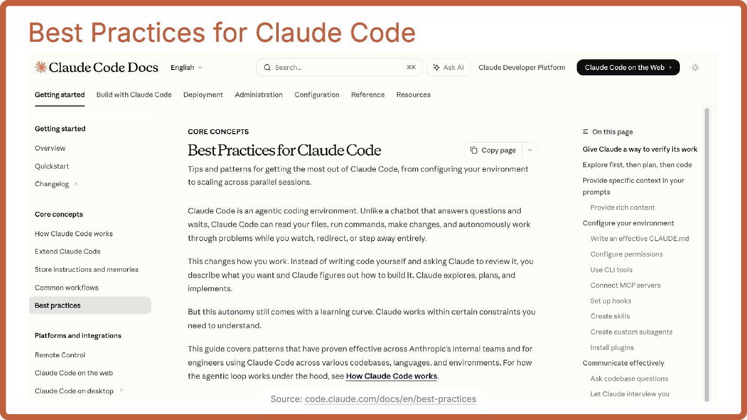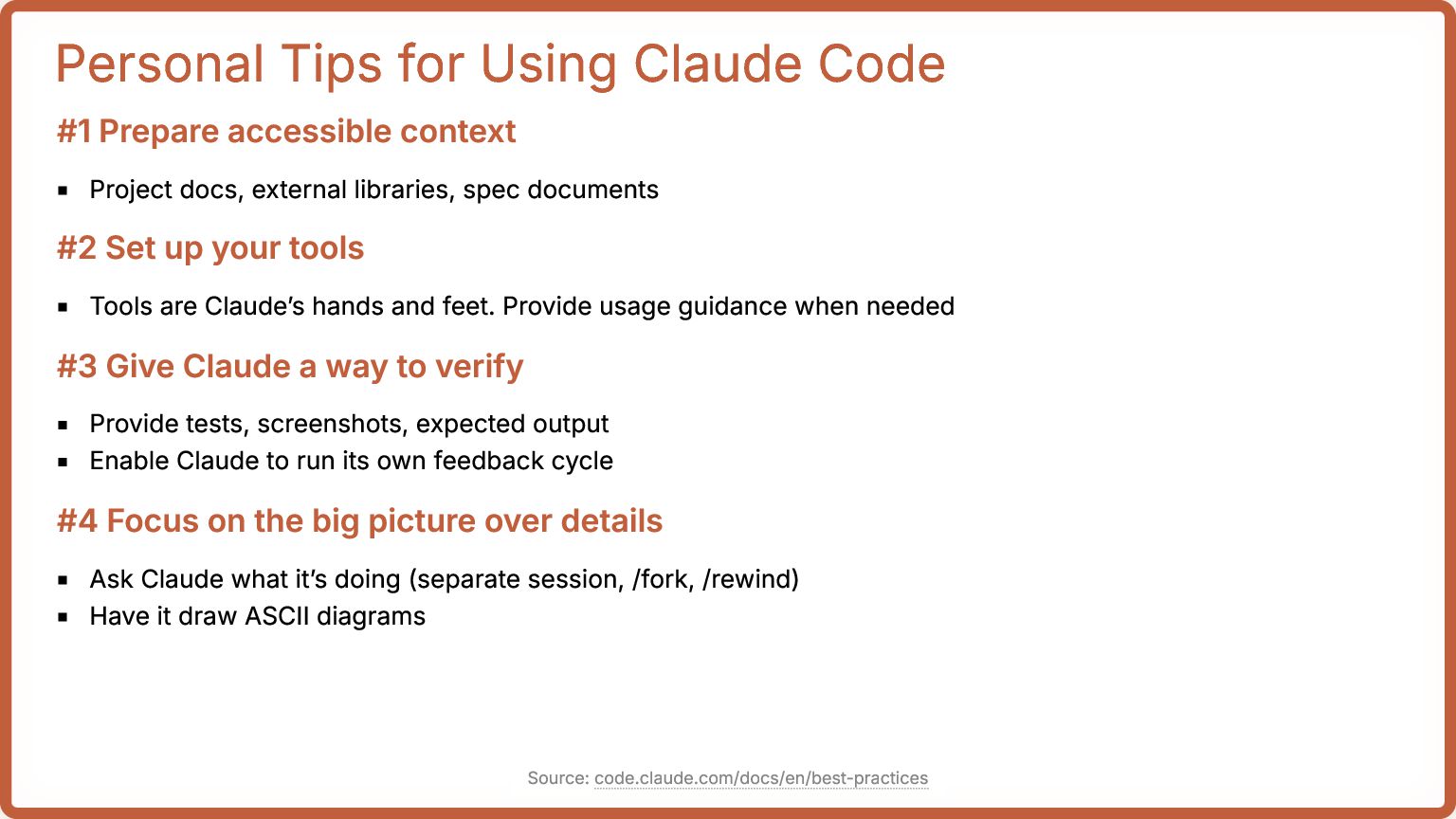 Project docs, external libraries, spec documents #2 Set up your tools Tools are Claude’s hands and feet. Provide usage guidance when needed #3 Give Claude a way to verify Provide tests, screenshots, expected output Enable Claude to run its own feedback cycle #4 Focus on the big picture over details Ask Claude what it’s doing (separate session, /fork, /rewind) Have it draw ASCII diagrams Source: code.claude.com/docs/en/best-practices