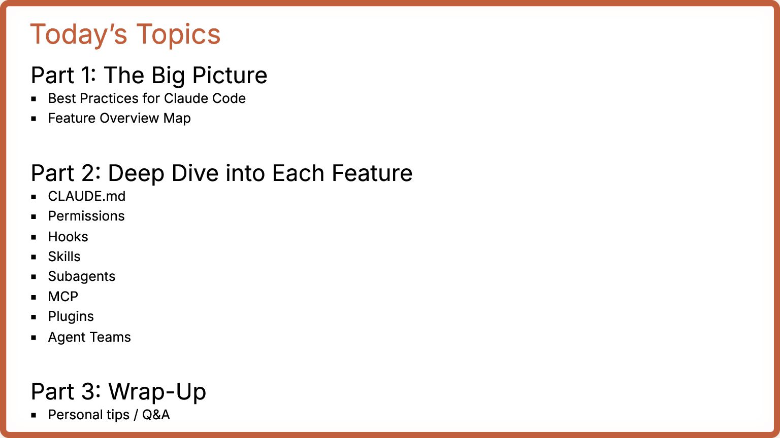 Claude Code Feature Overview Map Part 2: Deep Dive into Each Feature CLAUDE.md Permissions Hooks Skills Subagents MCP Plugins Agent Teams Part 3: Wrap-Up Personal tips / Q&A
