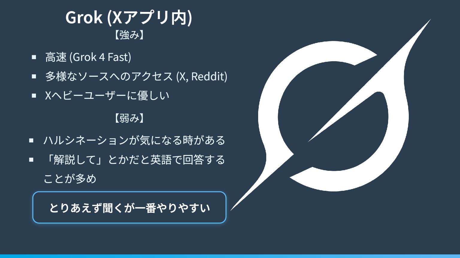 1. Grok (Xアプリ内) 【強み】 高速 (Grok 4 Fast) 多様なソースへのアクセス (X, Reddit)