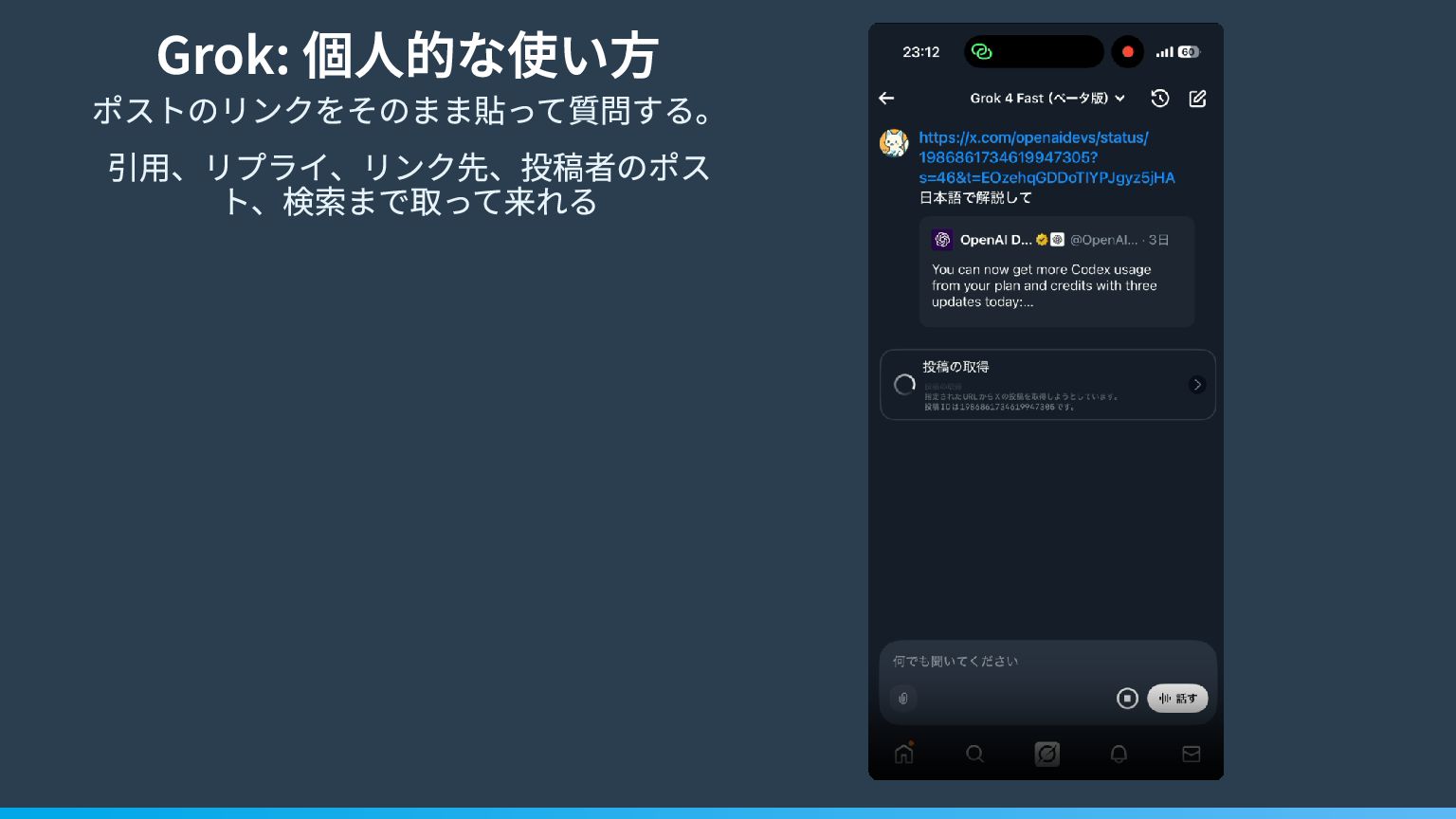 Xヘビーユーザーに優しい 【弱み】 ハルシネーションが気になる時がある 「解説して」とかだと英語で回答する ことが多め とりあえず聞くが一番やりやすい