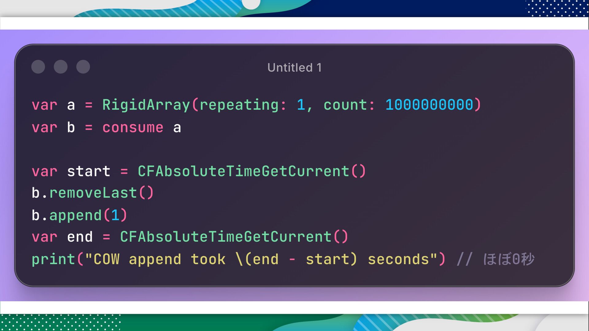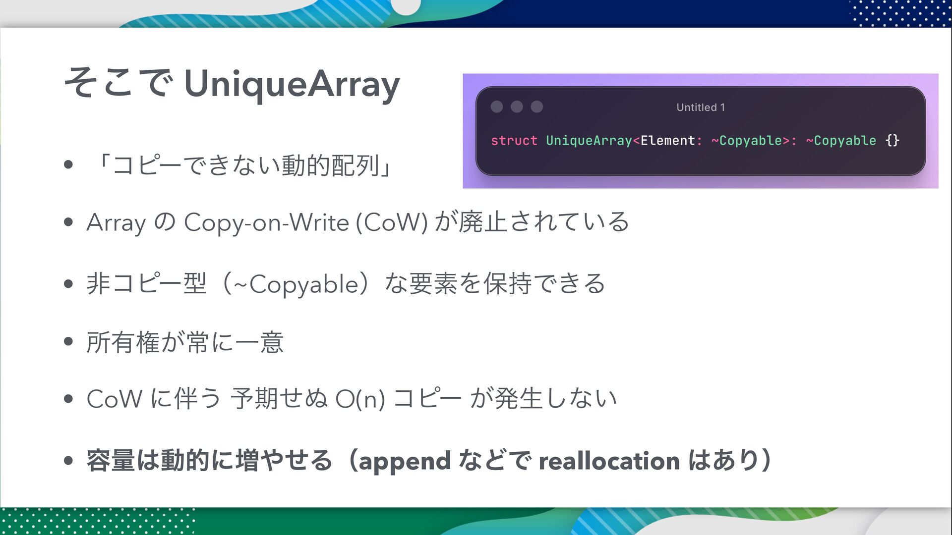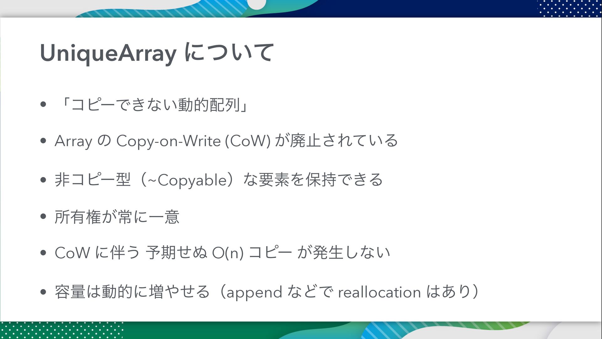 UniqueArray ʹ͍ͭͯ • ʮίϐʔͰ͖ͳ͍ಈతྻʯ • Array ͷ Copy-on-Write (CoW) ͕ഇࢭ͞Ε͍ͯΔ